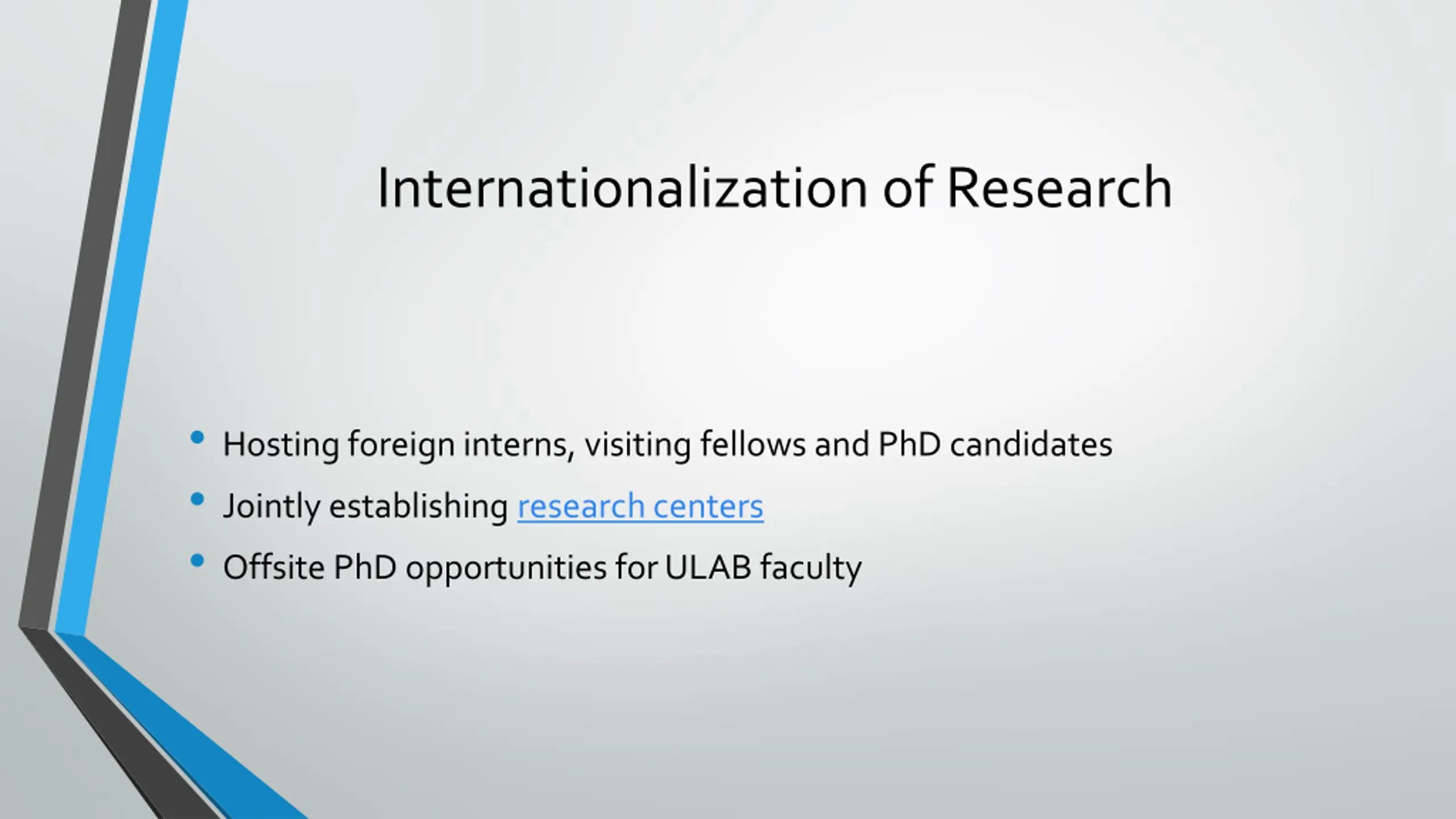 Internationalization of Research Hosting foreign interns, visiting fellows and PhD candidates Jointly establishing research centers Offsite PhD opportunities for ULAB faculty