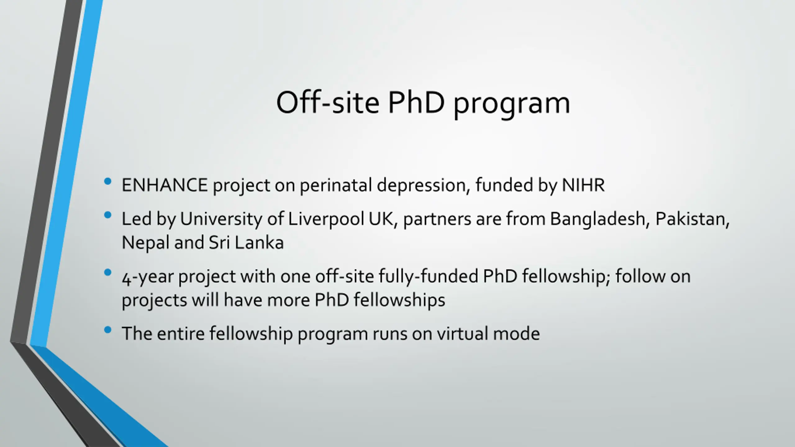 Off-site PhD program ENHANCE project on perinatal depression, funded by NIHR Led by University of Liverpool UK, partners are from Bangladesh, Pakistan, Nepal and Sri Lanka 4-year project with one off-site fully-funded PhD fellowship; follow on projects will have more PhD fellowships The entire fellowship program runs on virtual mode