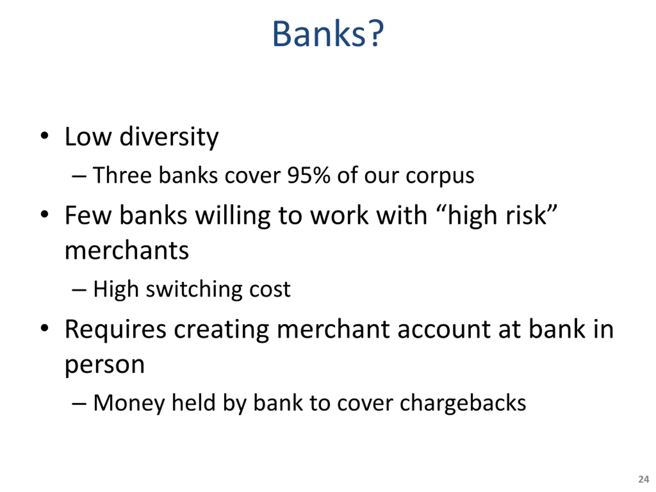 Banks? Low diversity Three banks cover 95% of our corpus Few banks willing to work with high risk merchants High switching cost Requires creating merchant account at bank in person Money held by bank to cover chargebacks 24