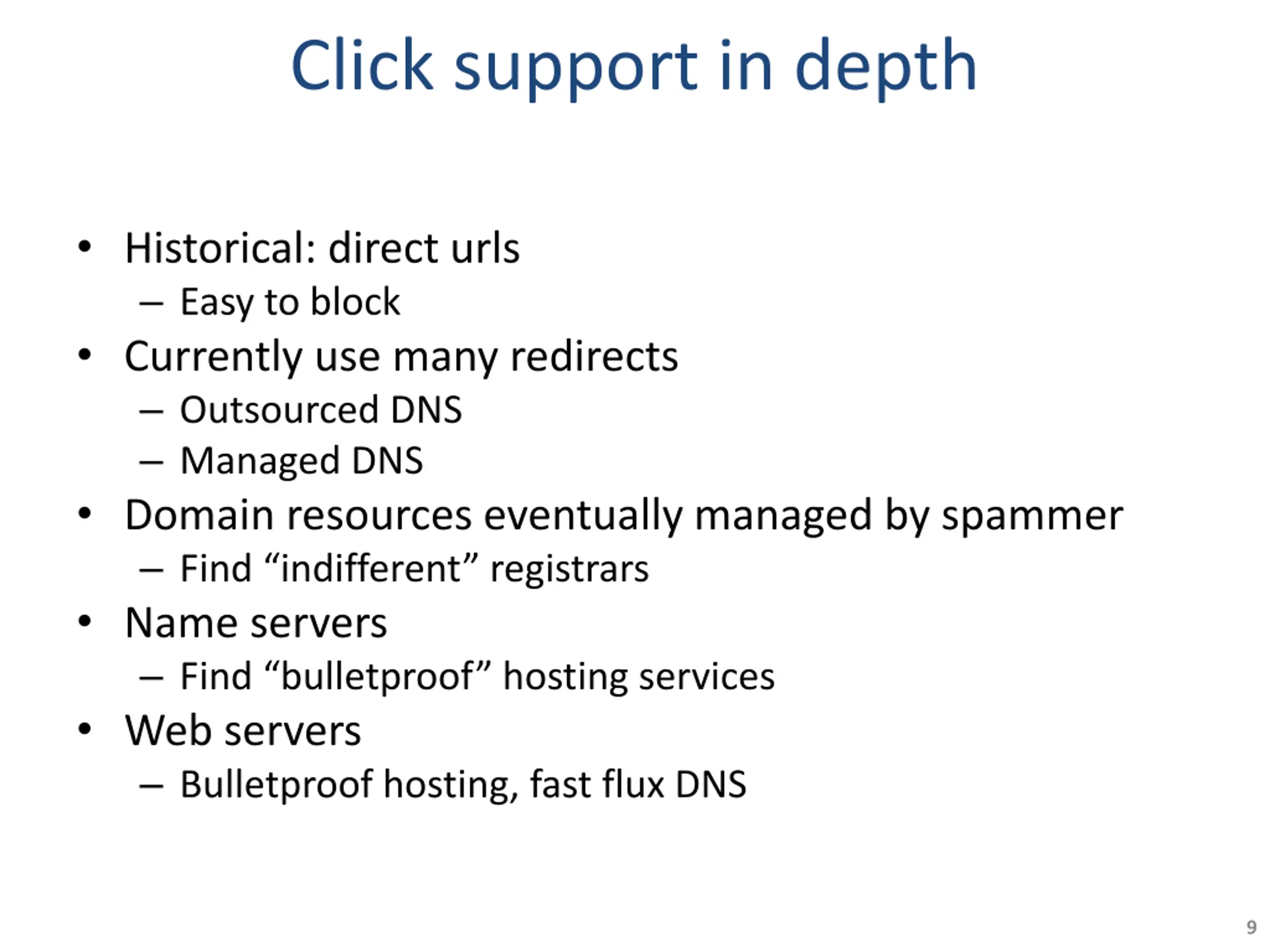 Click support in depth Historical: direct urls Easy to block Currently use many redirects Outsourced DNS Managed DNS Domain resources eventually managed by spammer Find indifferent registrars Name servers Find bulletproof hosting services Web servers Bulletproof hosting, fast flux DNS 9