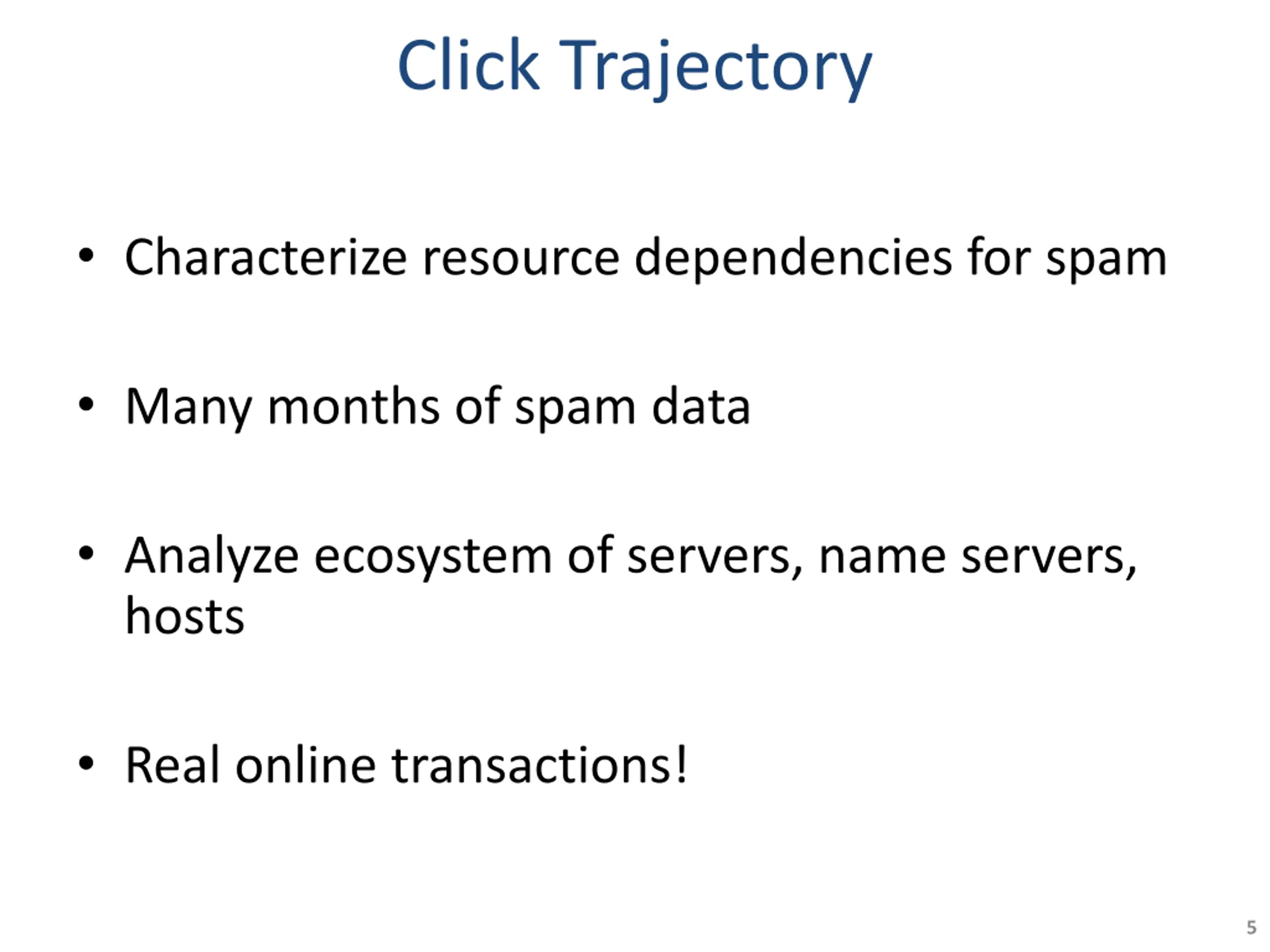 Click Trajectory Characterize resource dependencies for spam Many months of spam data Analyze ecosystem of servers, name servers, hosts Real online transactions! 5