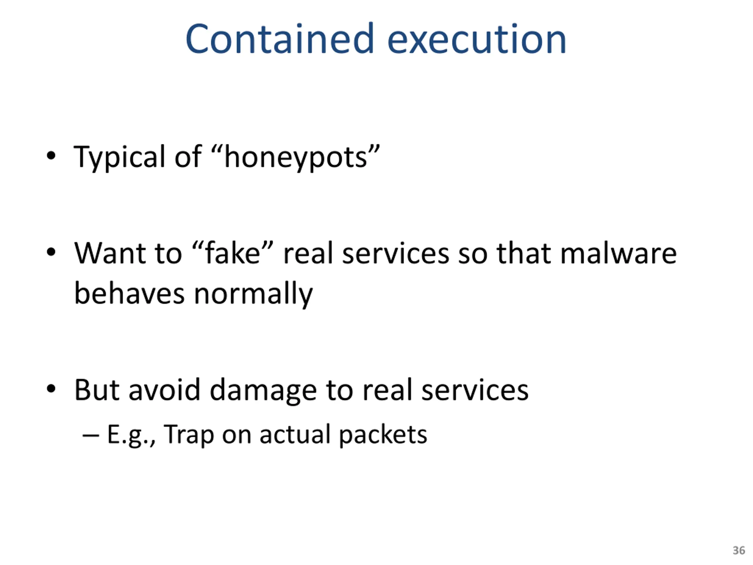 Contained execution Typical of honeypots Want to fake real services so that malware behaves normally But avoid damage to real services E.g., Trap on actual packets 36
