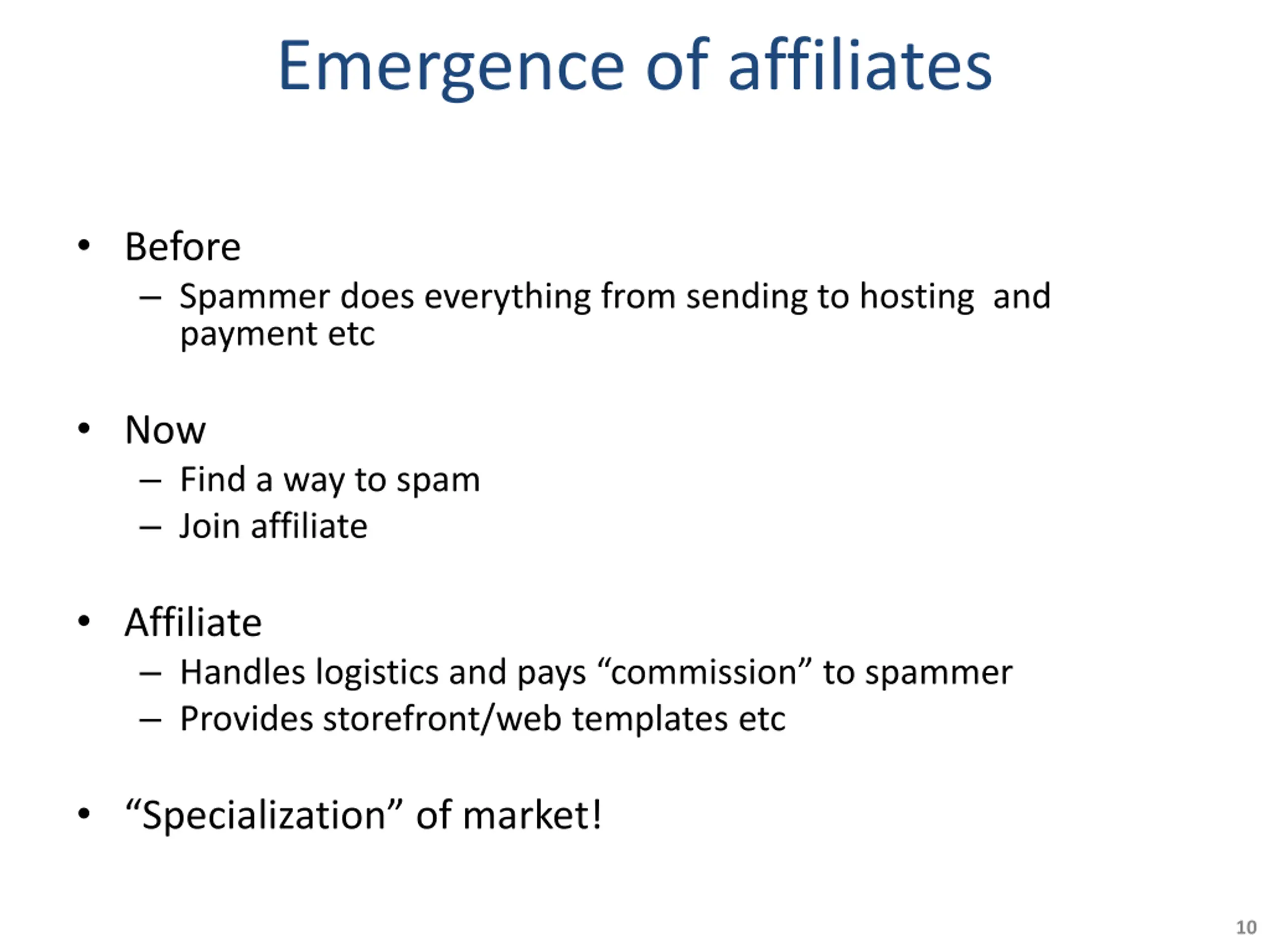 Emergence of affiliates Before Spammer does everything from sending to hosting and payment etc Now Find a way to spam Join affiliate Affiliate Handles logistics and pays commission to spammer Provides storefront/web templates etc Specialization of market! 10