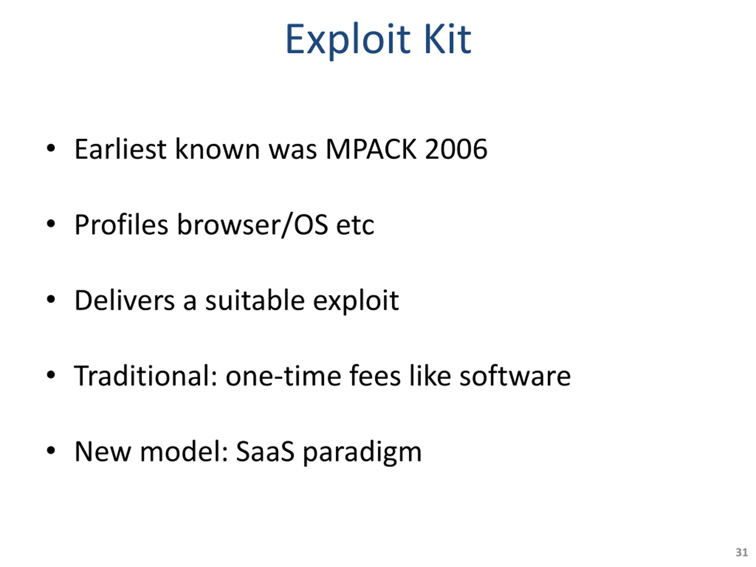 Exploit Kit Earliest known was MPACK 2006 Profiles browser/OS etc Delivers a suitable exploit Traditional: one-time fees like software New model: SaaS paradigm 31