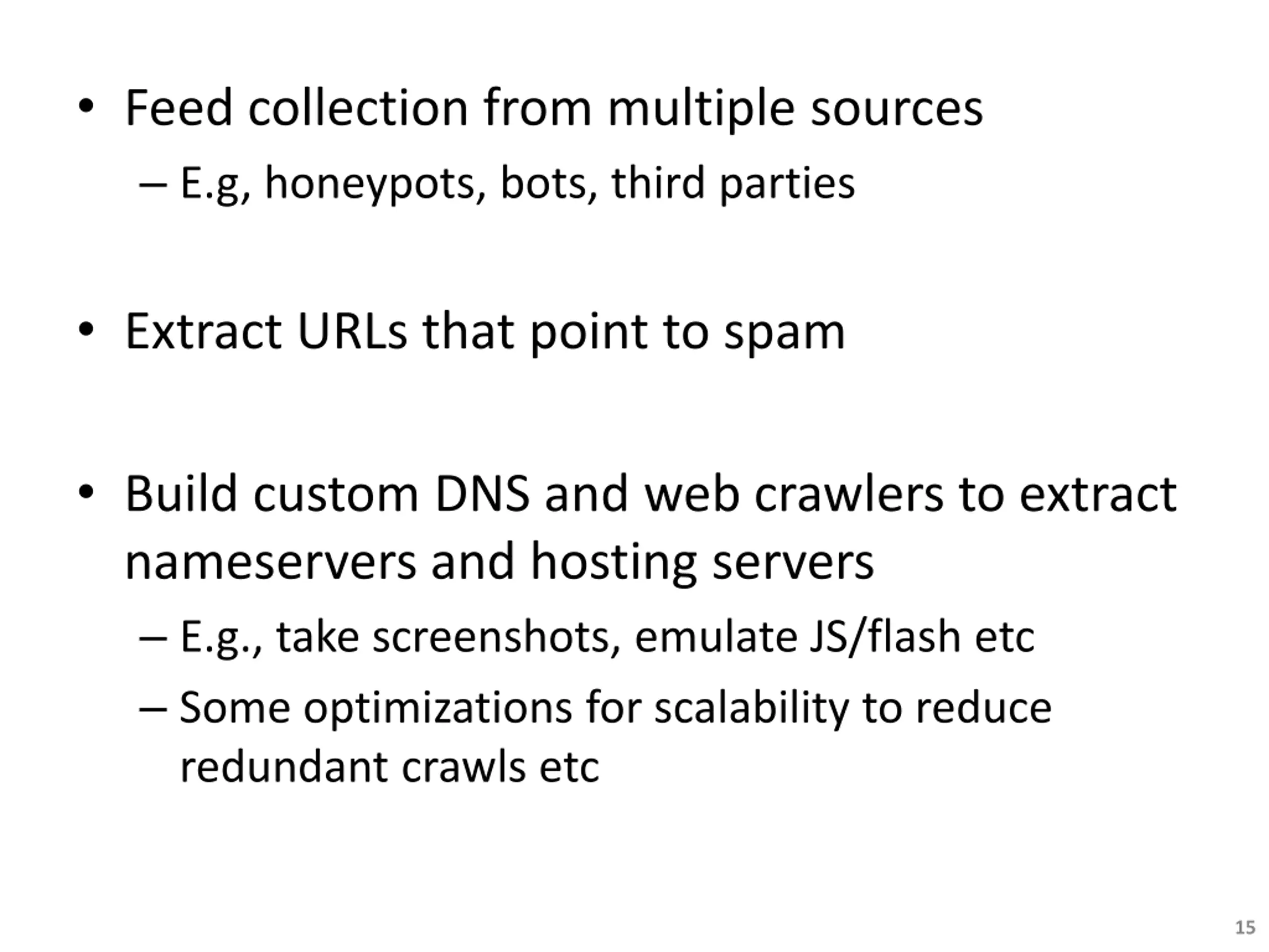 Feed collection from multiple sources E.g, honeypots, bots, third parties Extract URLs that point to spam Build custom DNS and web crawlers to extract nameservers and hosting servers E.g., take screenshots, emulate JS/flash etc Some optimizations for scalability to reduce redundant crawls etc 15