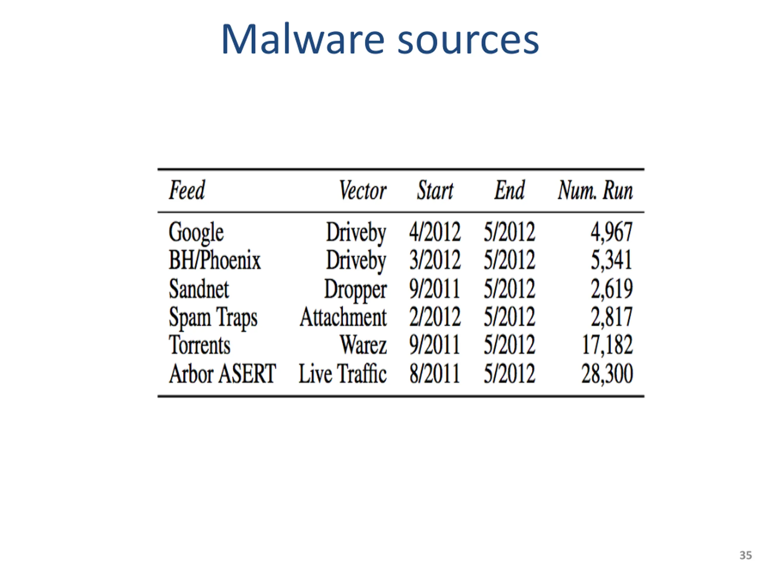 Key findings No single source of malware is comprehensive 9 exploit kits account for 92% of malicious URLS 29% are Blackhole Kits distribute 32 most prominent malware families Infrastructure for hosting is short lived 2.5 hrs URL crawling has limitations 38