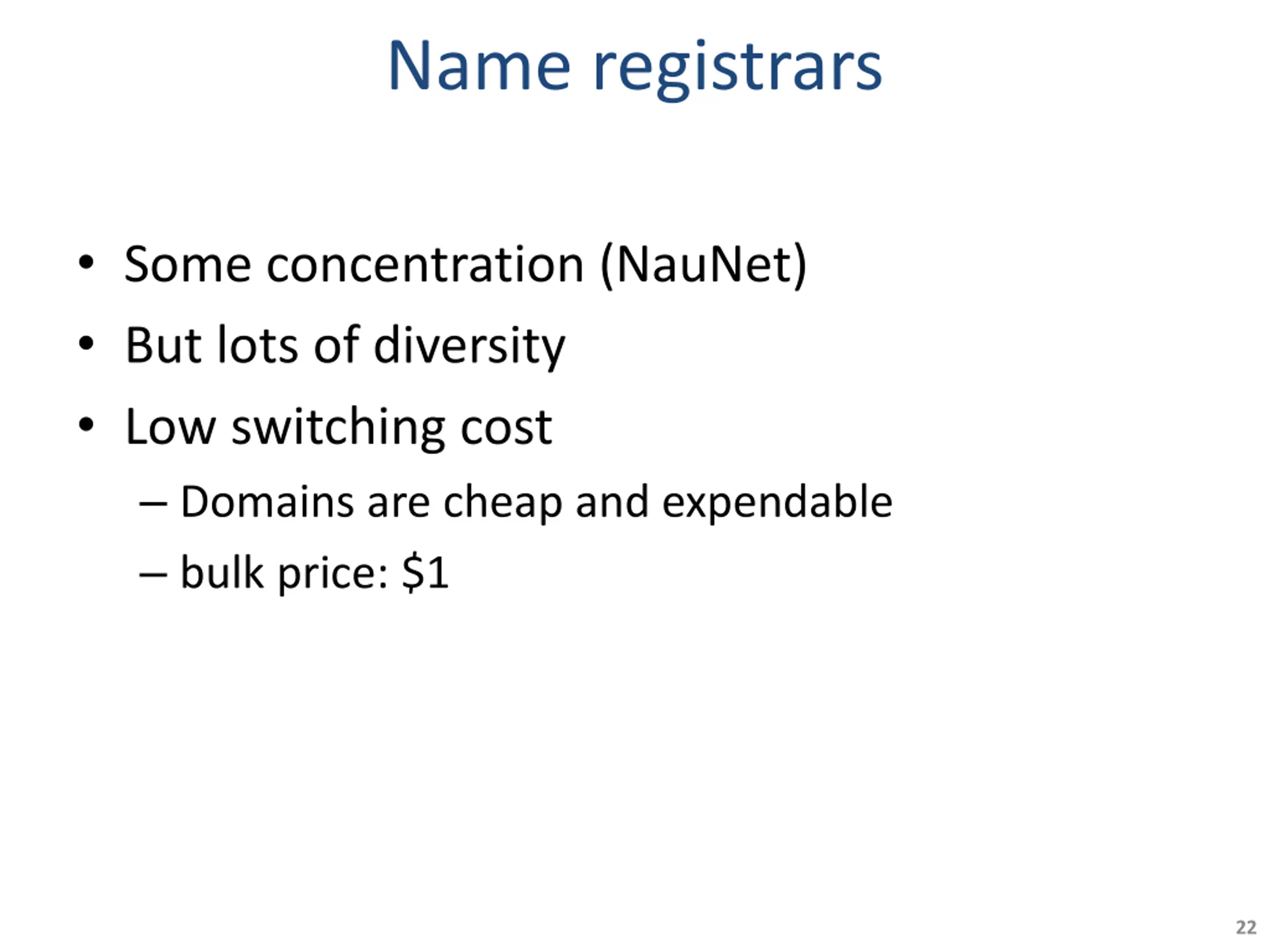 Name registrars Some concentration (NauNet) But lots of diversity Low switching cost Domains are cheap and expendable bulk price: $1 22