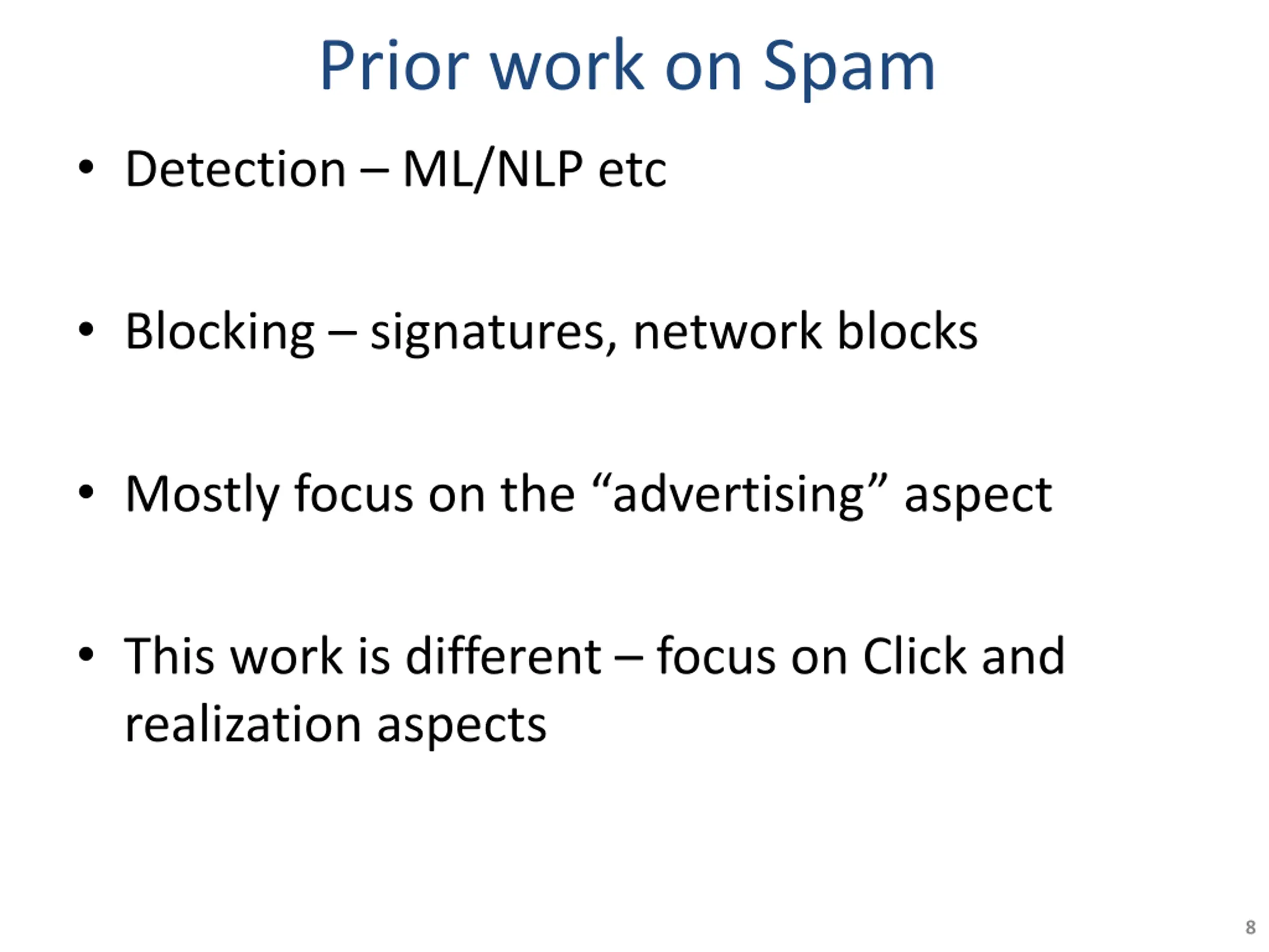 Prior work on Spam Detection ML/NLP etc Blocking signatures, network blocks Mostly focus on the advertising aspect This work is different focus on Click and realization aspects 8