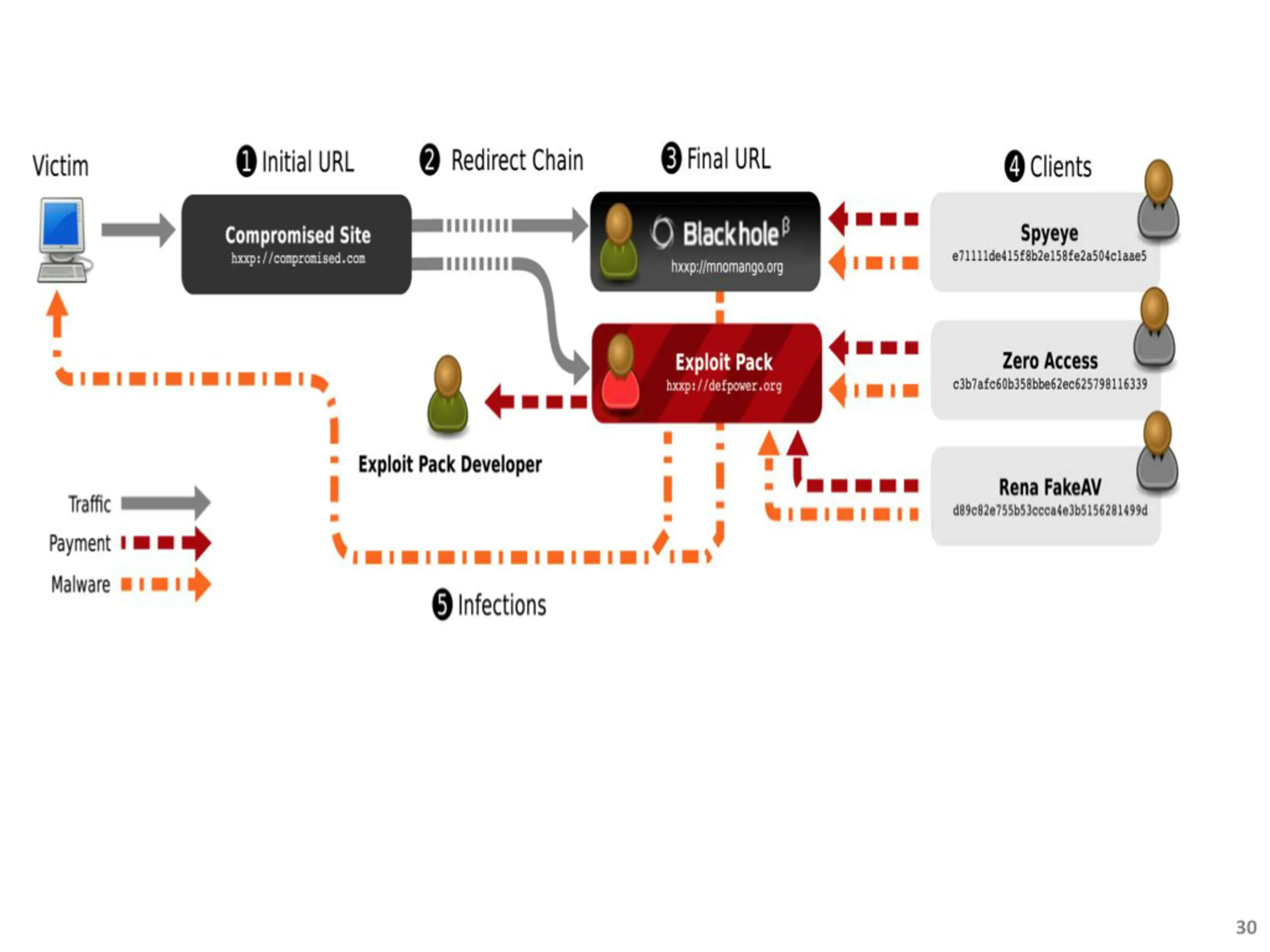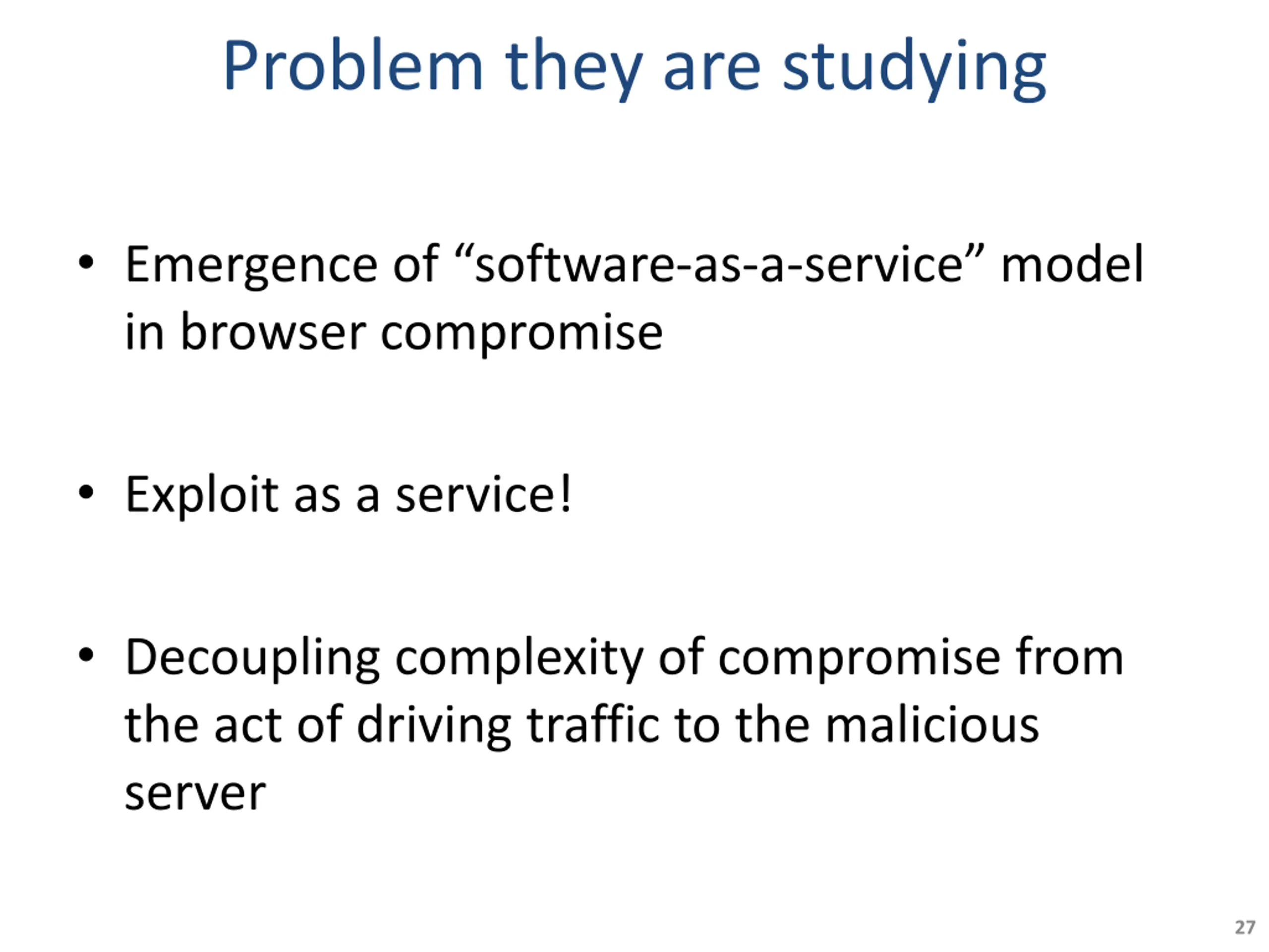 Problem they are studying Emergence of software-as-a-service model in browser compromise Exploit as a service! Decoupling complexity of compromise from the act of driving traffic to the malicious server 27