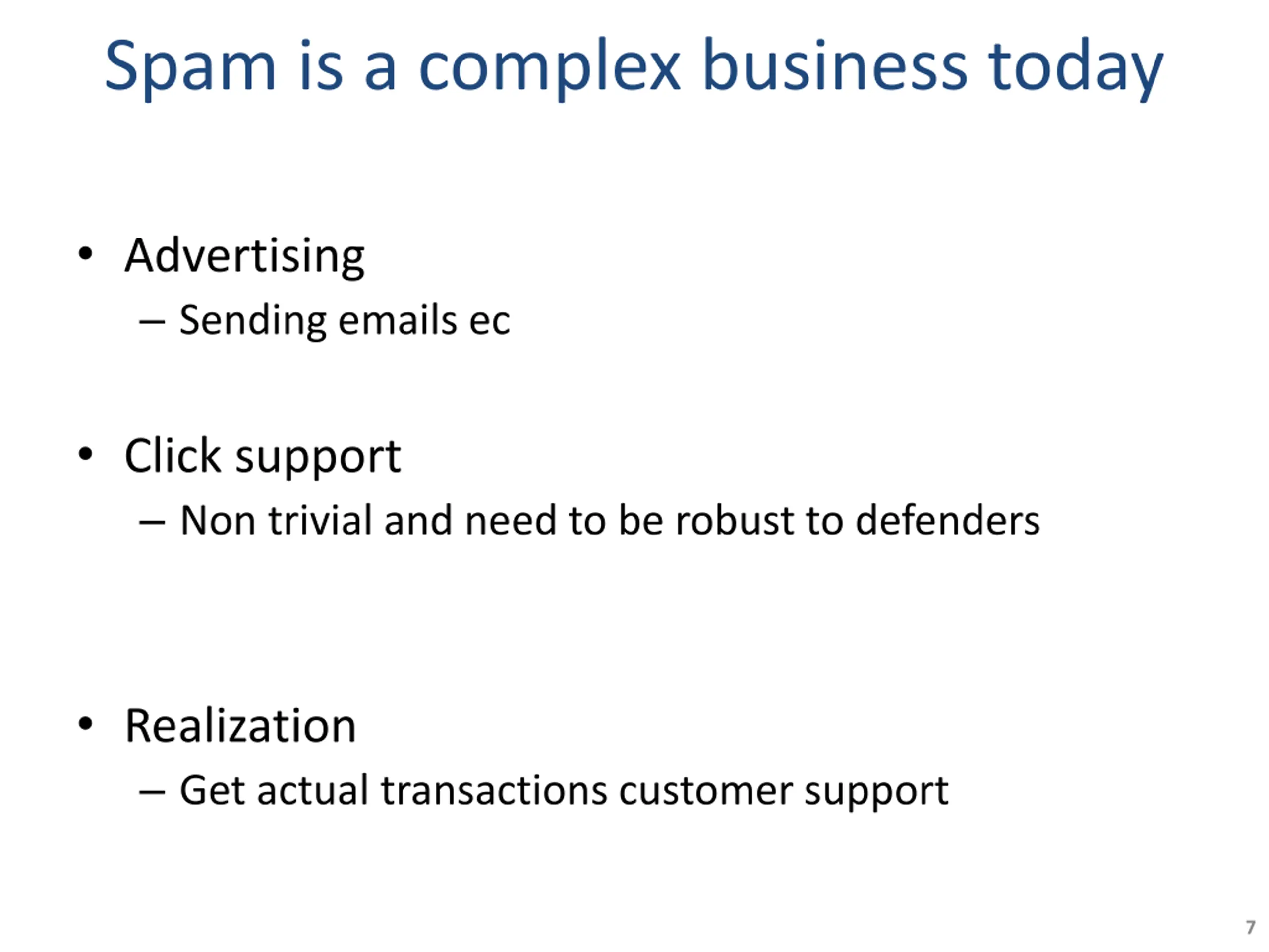 Spam is a complex business today Advertising Sending emails ec Click support Non trivial and need to be robust to defenders Realization Get actual transactions customer support 7