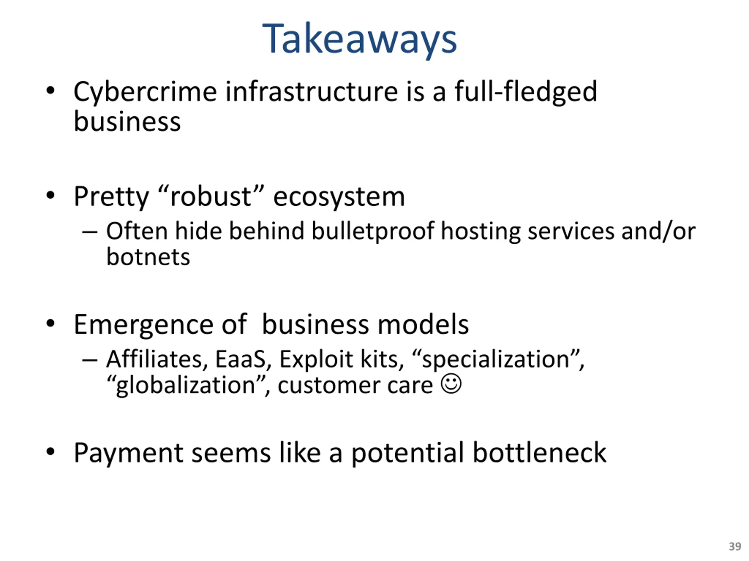 Takeaways Cybercrime infrastructure is a full-fledged business Pretty robust ecosystem Often hide behind bulletproof hosting services and/or botnets Emergence of business models Affiliates, EaaS, Exploit kits, specialization , globalization , customer care Payment seems like a potential bottleneck 39
