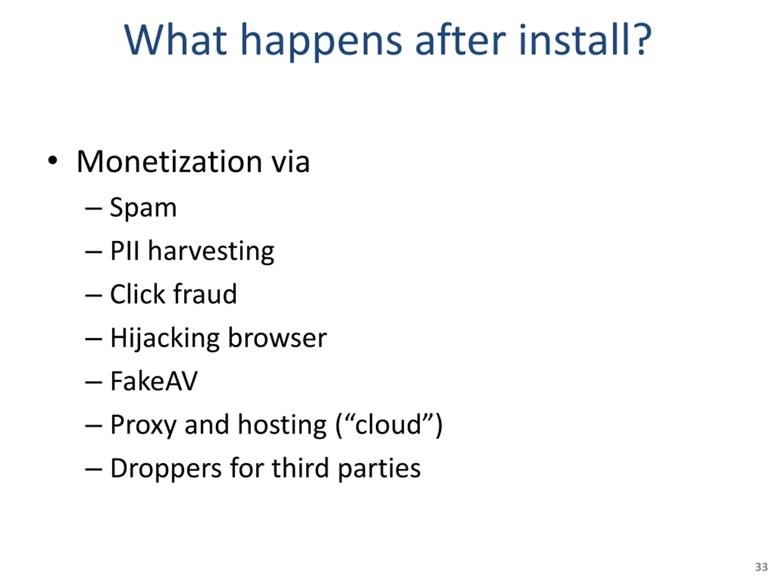 What happens after install? Monetization via Spam PII harvesting Click fraud Hijacking browser FakeAV Proxy and hosting ( cloud ) Droppers for third parties 33