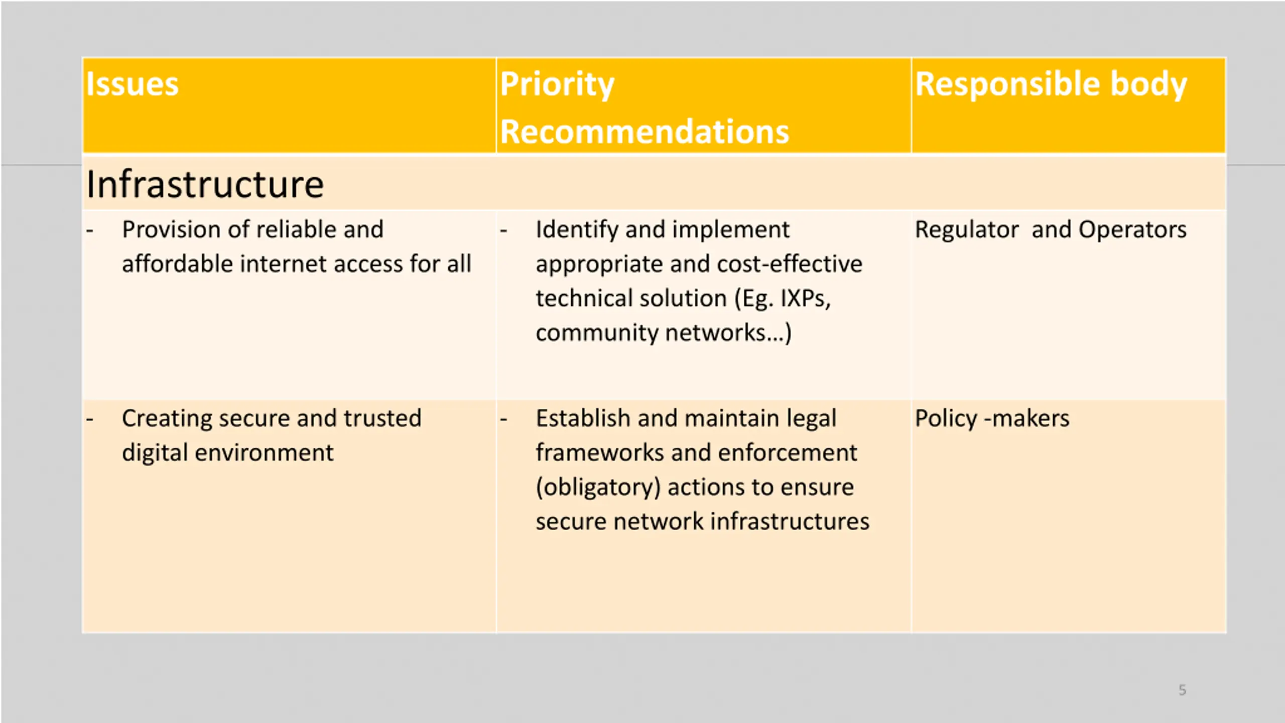 Issues Priority Recommendations Responsible body Infrastructure - Provision of reliable and affordable internet access for all - Identify and implement appropriate and cost-effective technical solution (Eg. IXPs, community networks ) Regulator and Operators - Creating secure and trusted digital environment - Establish and maintain legal frameworks and enforcement (obligatory) actions to ensure secure network infrastructures Policy -makers 5