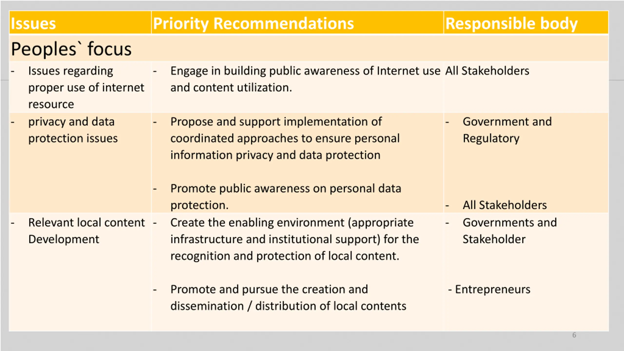 Issues Peoples` focus - Issues regarding proper use of internet resource - privacy and data protection issues Priority Recommendations Responsible body - Engage in building public awareness of Internet use and content utilization. All Stakeholders - Propose and support implementation of coordinated approaches to ensure personal information privacy and data protection - Government and Regulatory - Promote public awareness on personal data protection. Create the enabling environment (appropriate infrastructure and institutional support) for the recognition and protection of local content. - - All Stakeholders Governments and Stakeholder - Relevant local content Development - - Promote and pursue the creation and dissemination / distribution of local contents - Entrepreneurs 6