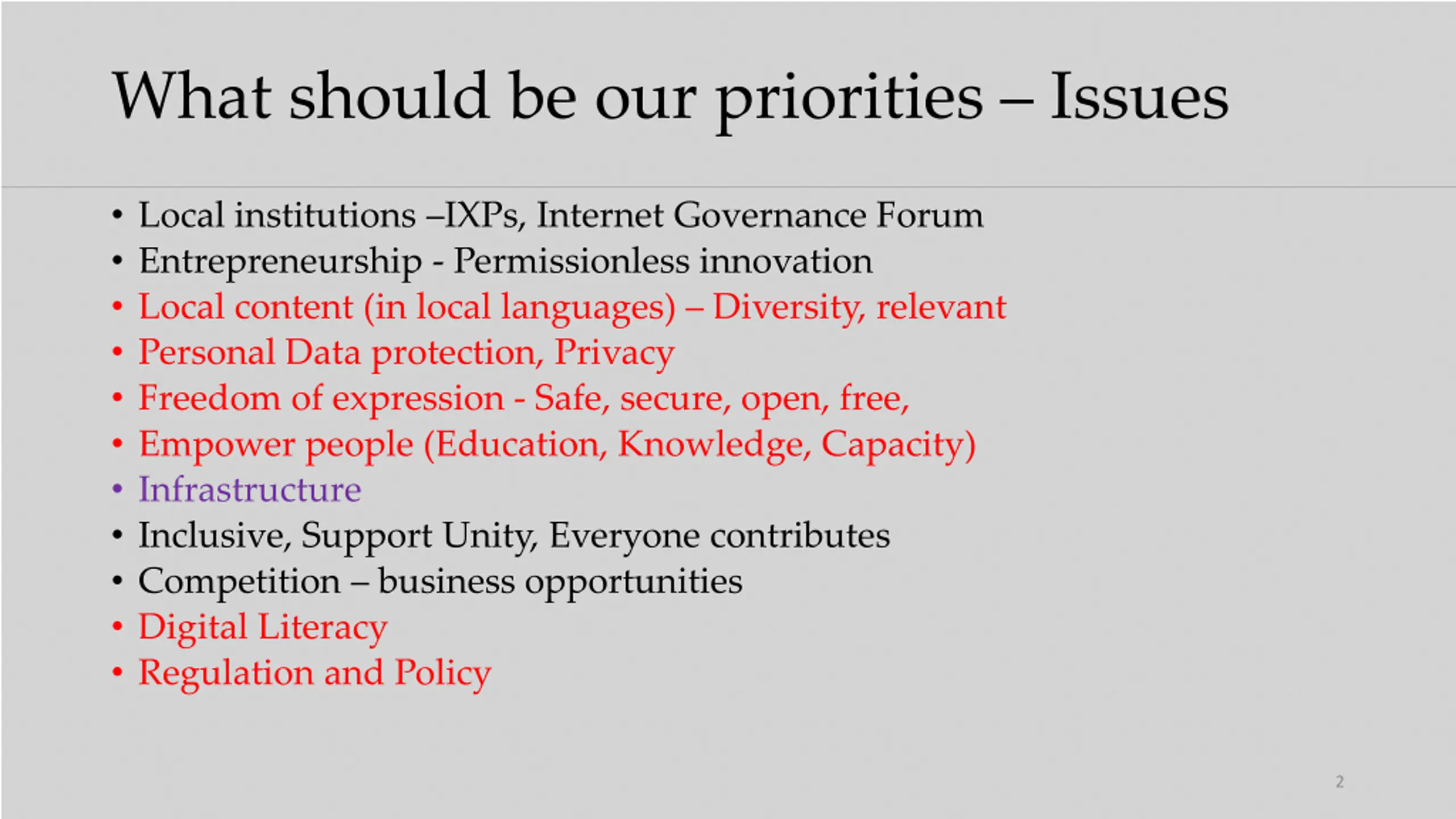 What should be our priorities Issues Local institutions IXPs, Internet Governance Forum Entrepreneurship - Permissionless innovation Local content (in local languages) Diversity, relevant Personal Data protection, Privacy Freedom of expression - Safe, secure, open, free, Empower people (Education, Knowledge, Capacity) Infrastructure Inclusive, Support Unity, Everyone contributes Competition business opportunities Digital Literacy Regulation and Policy 2