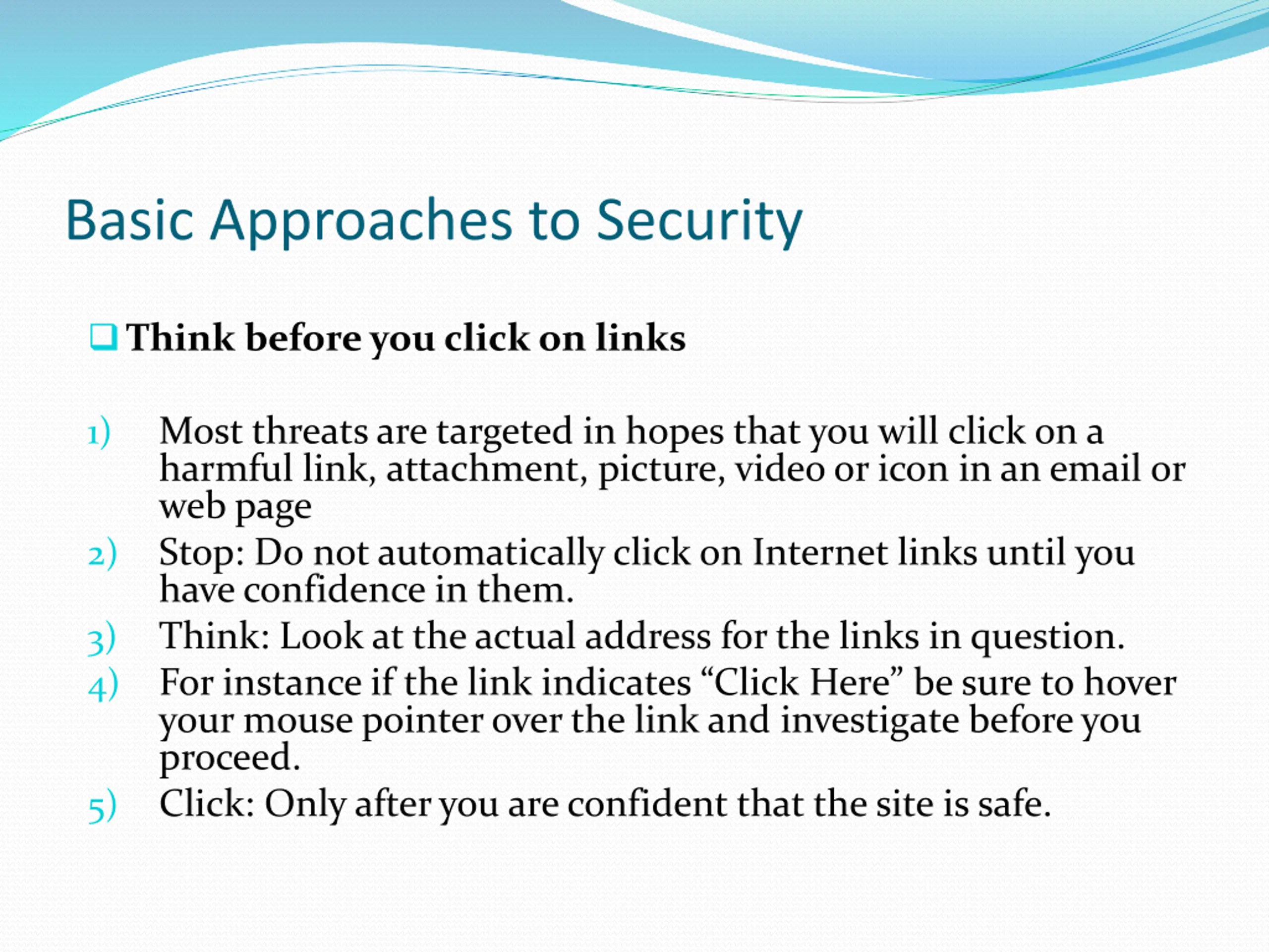 Basic Approaches to Security Think before you click on links Most threats are targeted in hopes that you will click on a harmful link, attachment, picture, video or icon in an email or web page Stop: Do not automatically click on Internet links until you have confidence in them. Think: Look at the actual address for the links in question. For instance if the link indicates Click Here be sure to hover your mouse pointer over the link and investigate before you proceed. Click: Only after you are confident that the site is safe. 1) 2) 3) 4) 5)