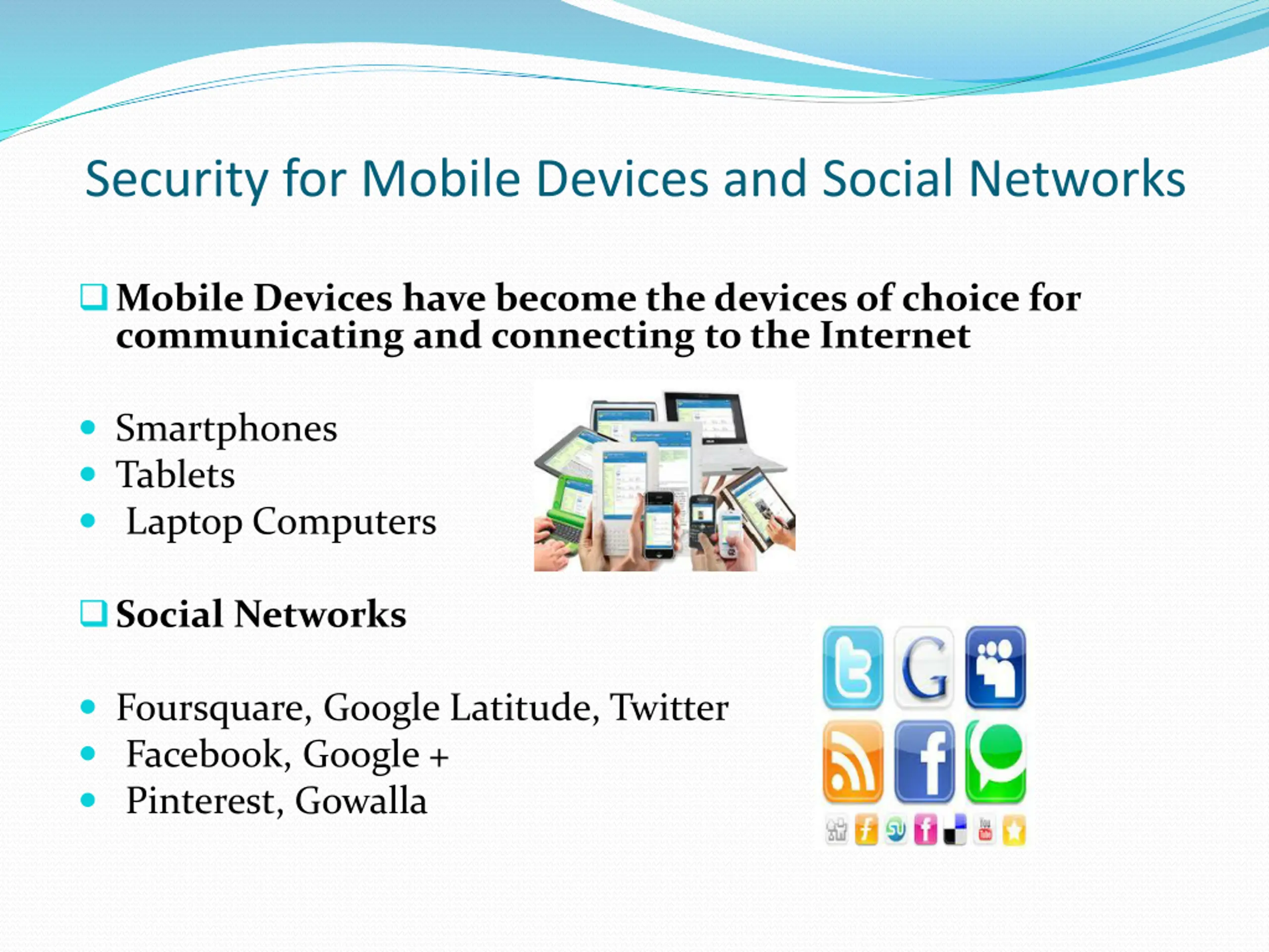 Security for Mobile Devices and Social Networks Mobile Devices have become the devices of choice for communicating and connecting to the Internet Smartphones Tablets Laptop Computers Social Networks Foursquare, Google Latitude, Twitter Facebook, Google + Pinterest, Gowalla