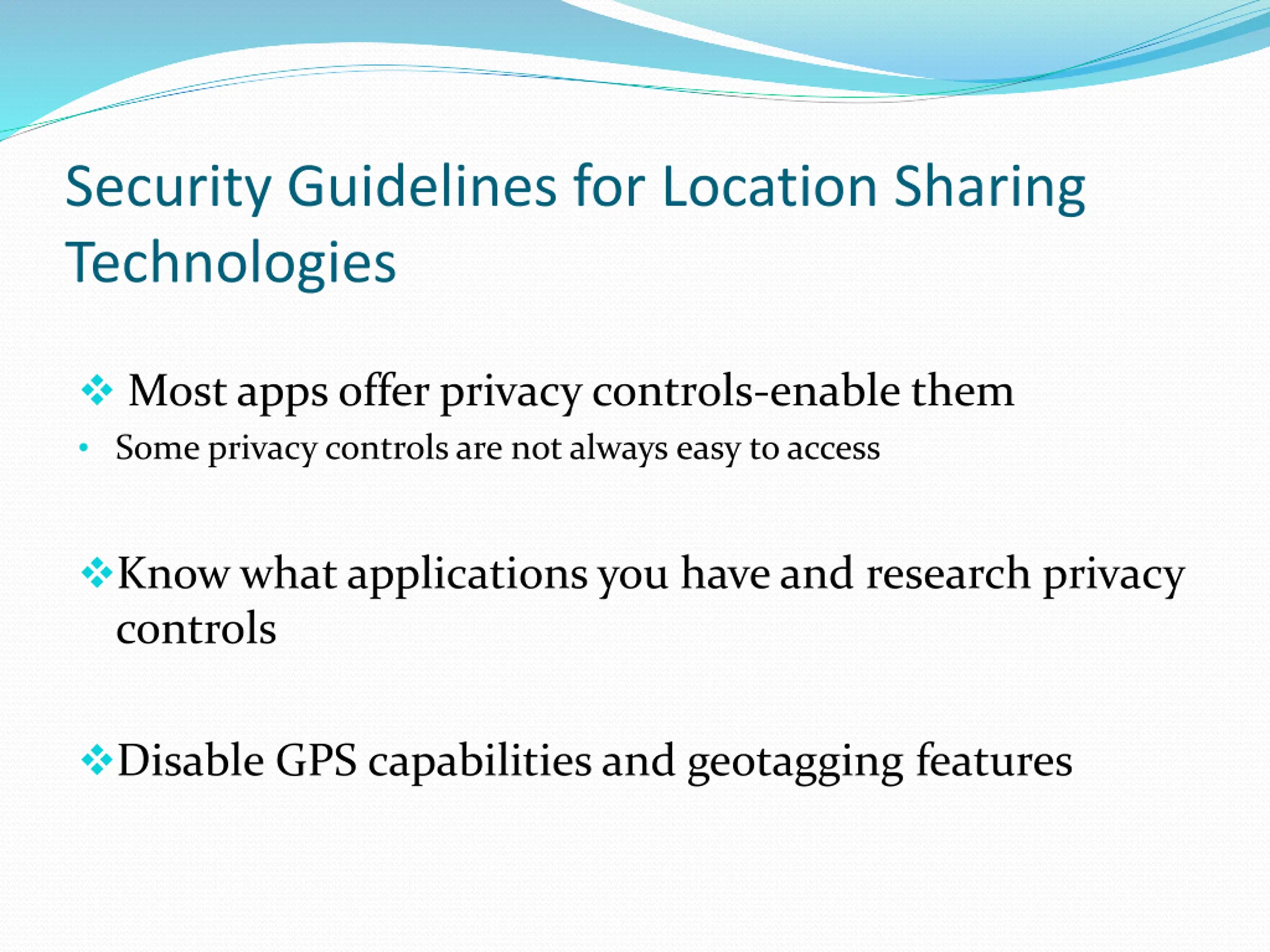 Security Guidelines for Location Sharing Technologies Most apps offer privacy controls-enable them Some privacy controls are not always easy to access Know what applications you have and research privacy controls Disable GPS capabilities and geotagging features