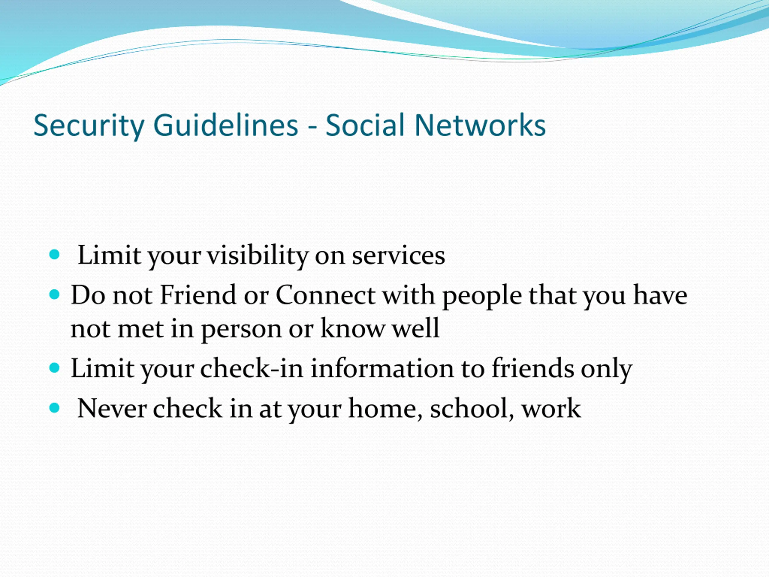 Security Guidelines - Social Networks Limit your visibility on services Do not Friend or Connect with people that you have not met in person or know well Limit your check-in information to friends only Never check in at your home, school, work