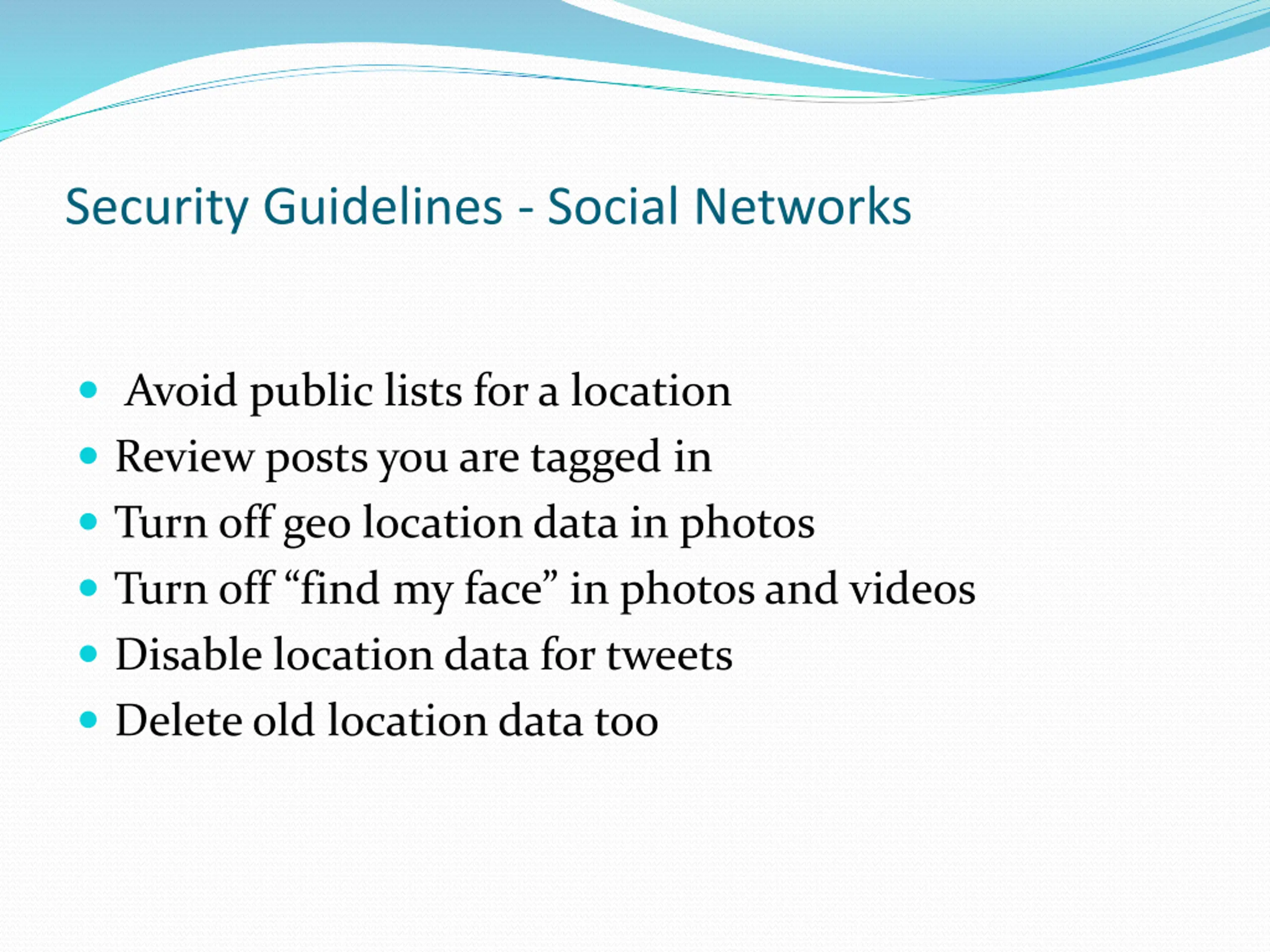 Security Guidelines - Social Networks Avoid public lists for a location Review posts you are tagged in Turn off geo location data in photos Turn off find my face in photos and videos Disable location data for tweets Delete old location data too
