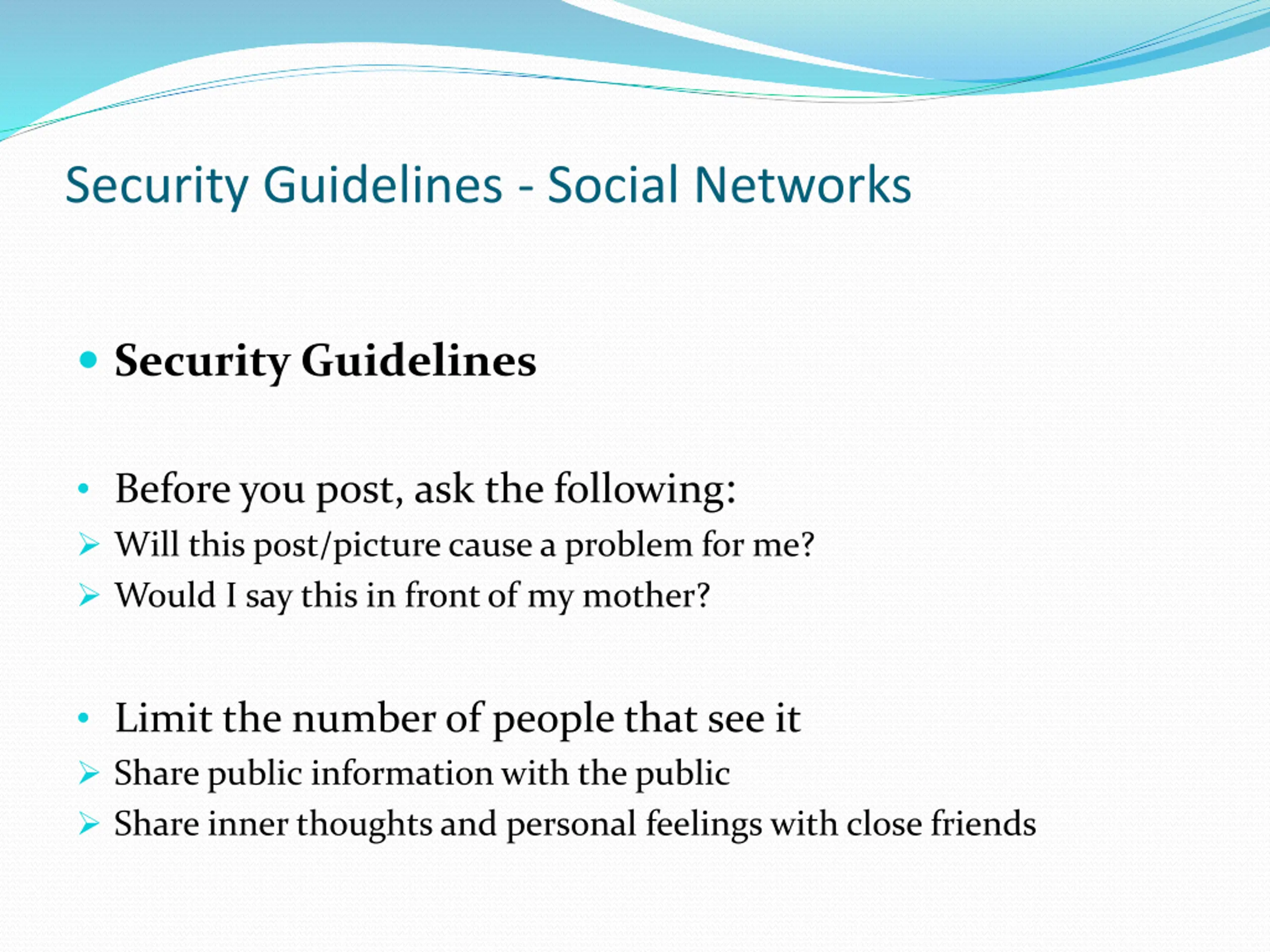Security Guidelines - Social Networks Security Guidelines Before you post, ask the following: Will this post/picture cause a problem for me? Would I say this in front of my mother? Limit the number of people that see it Share public information with the public Share inner thoughts and personal feelings with close friends