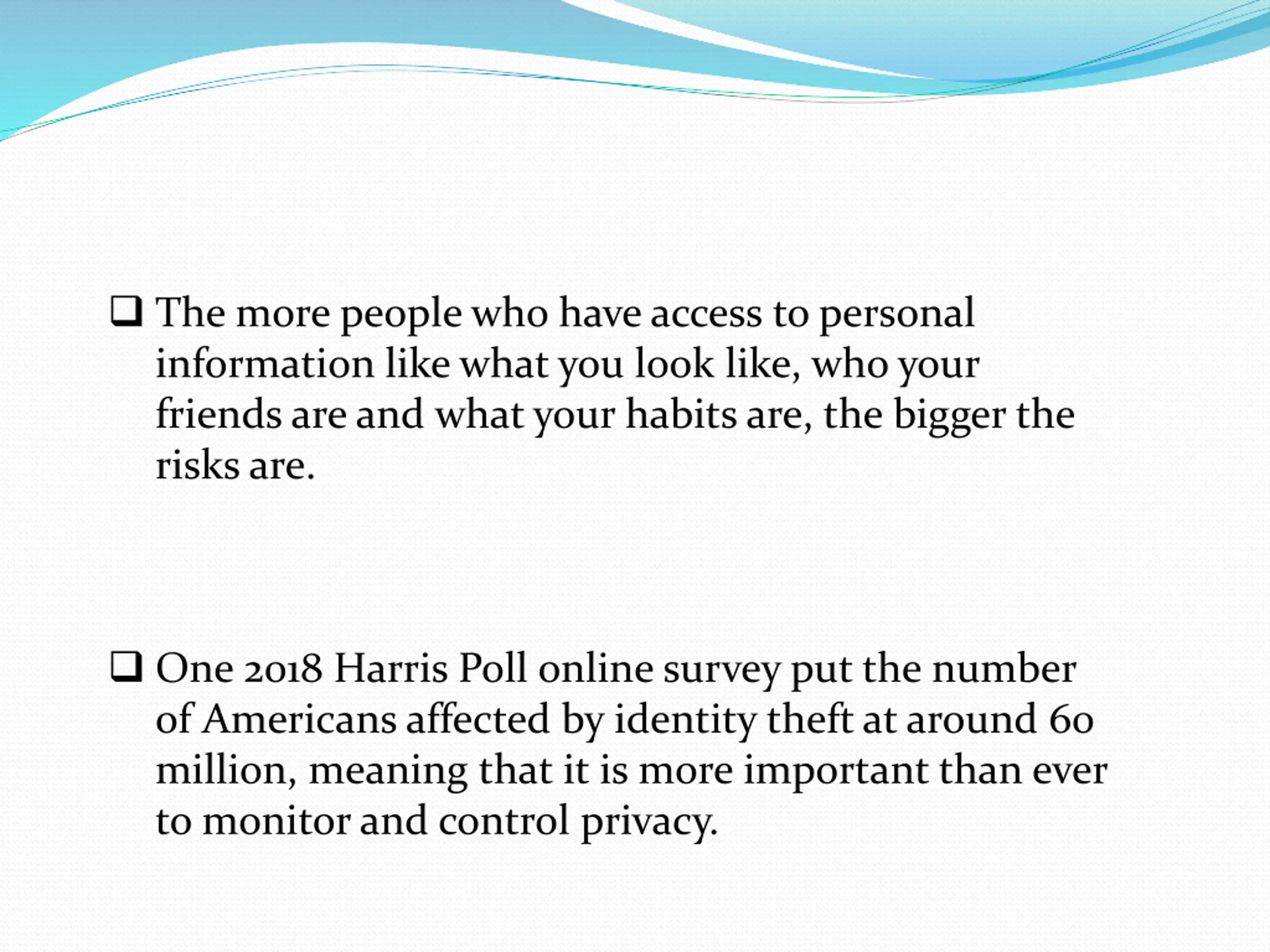The more people who have access to personal information like what you look like, who your friends are and what your habits are, the bigger the risks are. One 2018 Harris Poll online survey put the number of Americans affected by identity theft at around 60 million, meaning that it is more important than ever to monitor and control privacy.