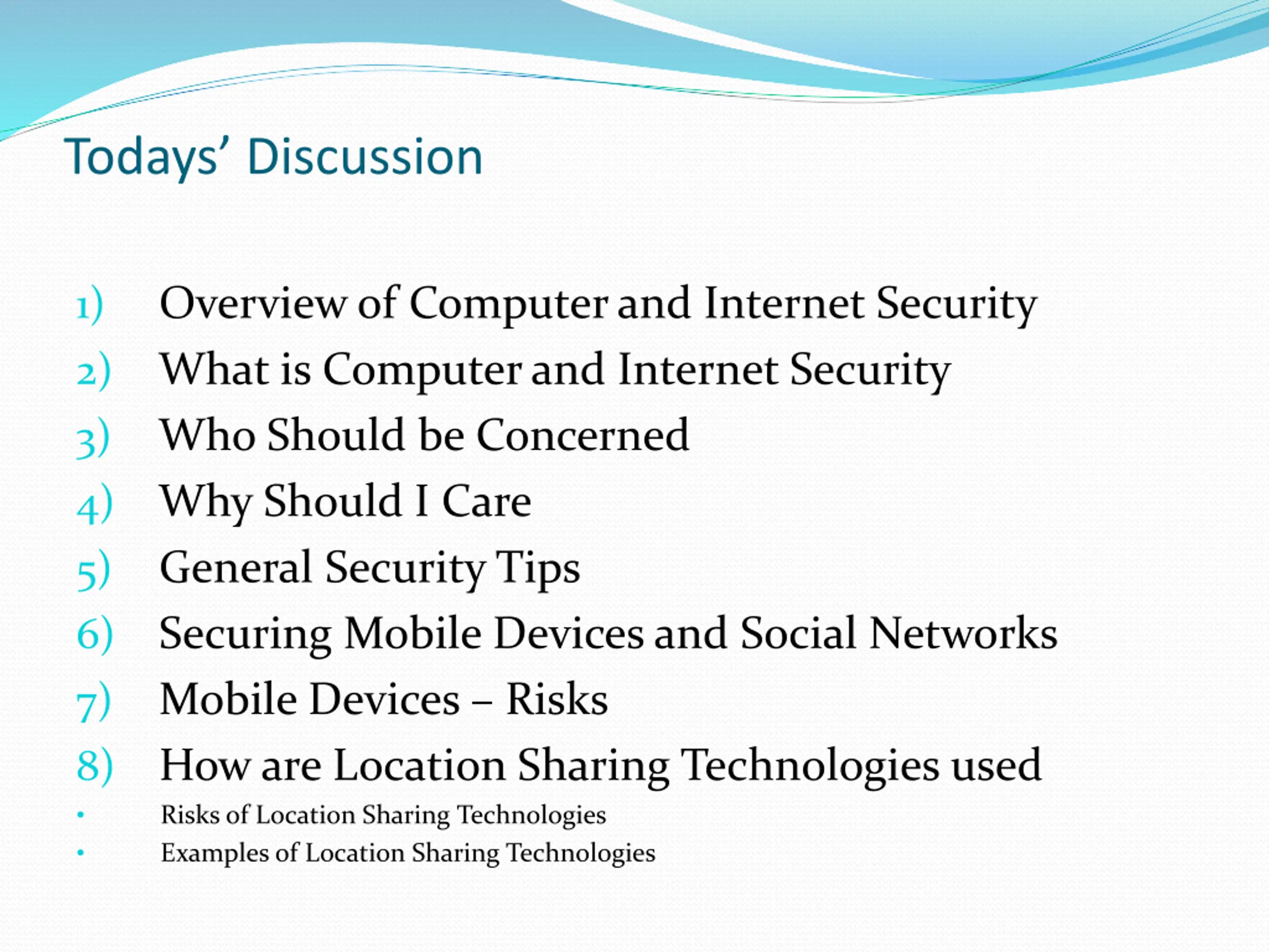 Todays Discussion Overview of Computer and Internet Security 1) 2) What is Computer and Internet Security 3) Who Should be Concerned 4) Why Should I Care 5) General Security Tips 6) Securing Mobile Devices and Social Networks 7) Mobile Devices Risks 8) How are Location Sharing Technologies used Risks of Location Sharing Technologies Examples of Location Sharing Technologies