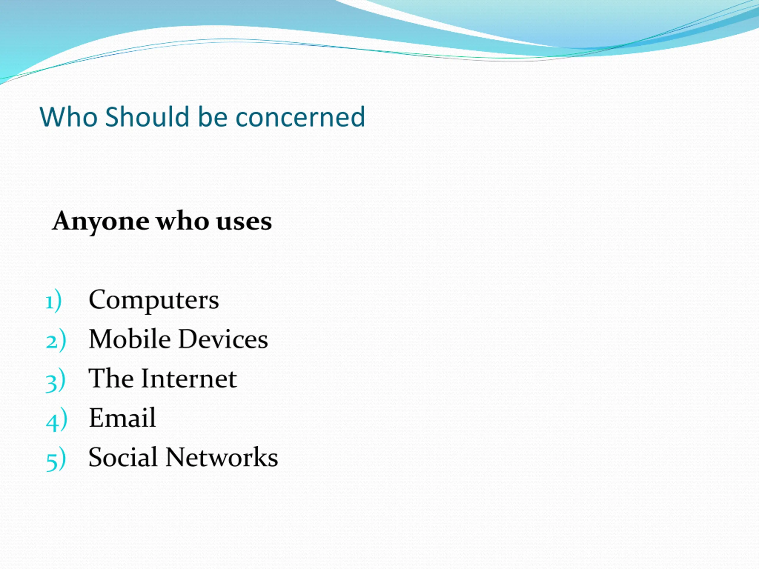 Who Should be concerned Anyone who uses Computers 1) 2) Mobile Devices 3) The Internet 4) Email 5) Social Networks