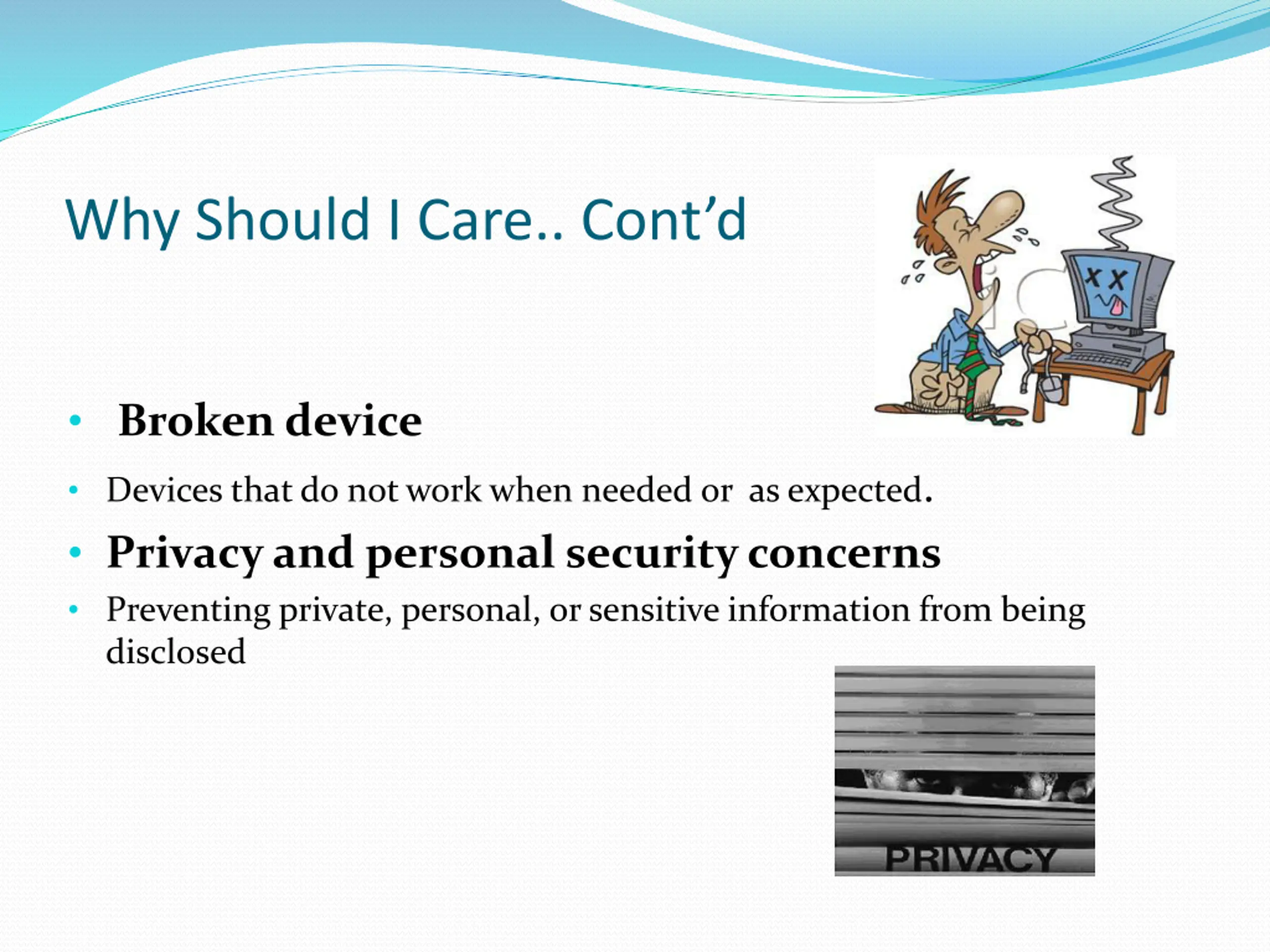 Why Should I Care.. Contd Broken device Devices that do not work when needed or as expected. Privacy and personal security concerns Preventing private, personal, or sensitive information from being disclosed
