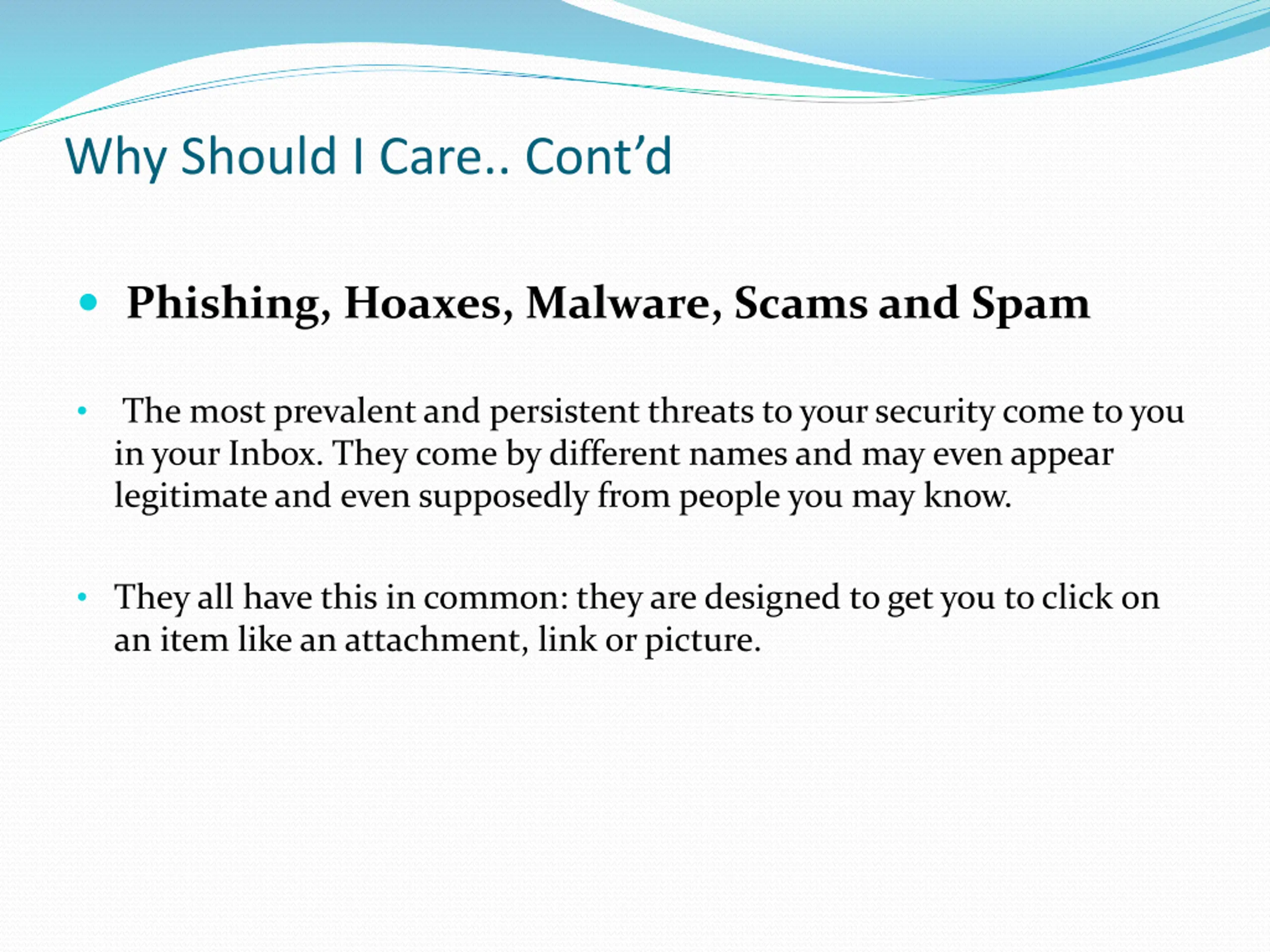 Why Should I Care.. Contd Phishing, Hoaxes, Malware, Scams and Spam The most prevalent and persistent threats to your security come to you in your Inbox. They come by different names and may even appear legitimate and even supposedly from people you may know. They all have this in common: they are designed to get you to click on an item like an attachment, link or picture.