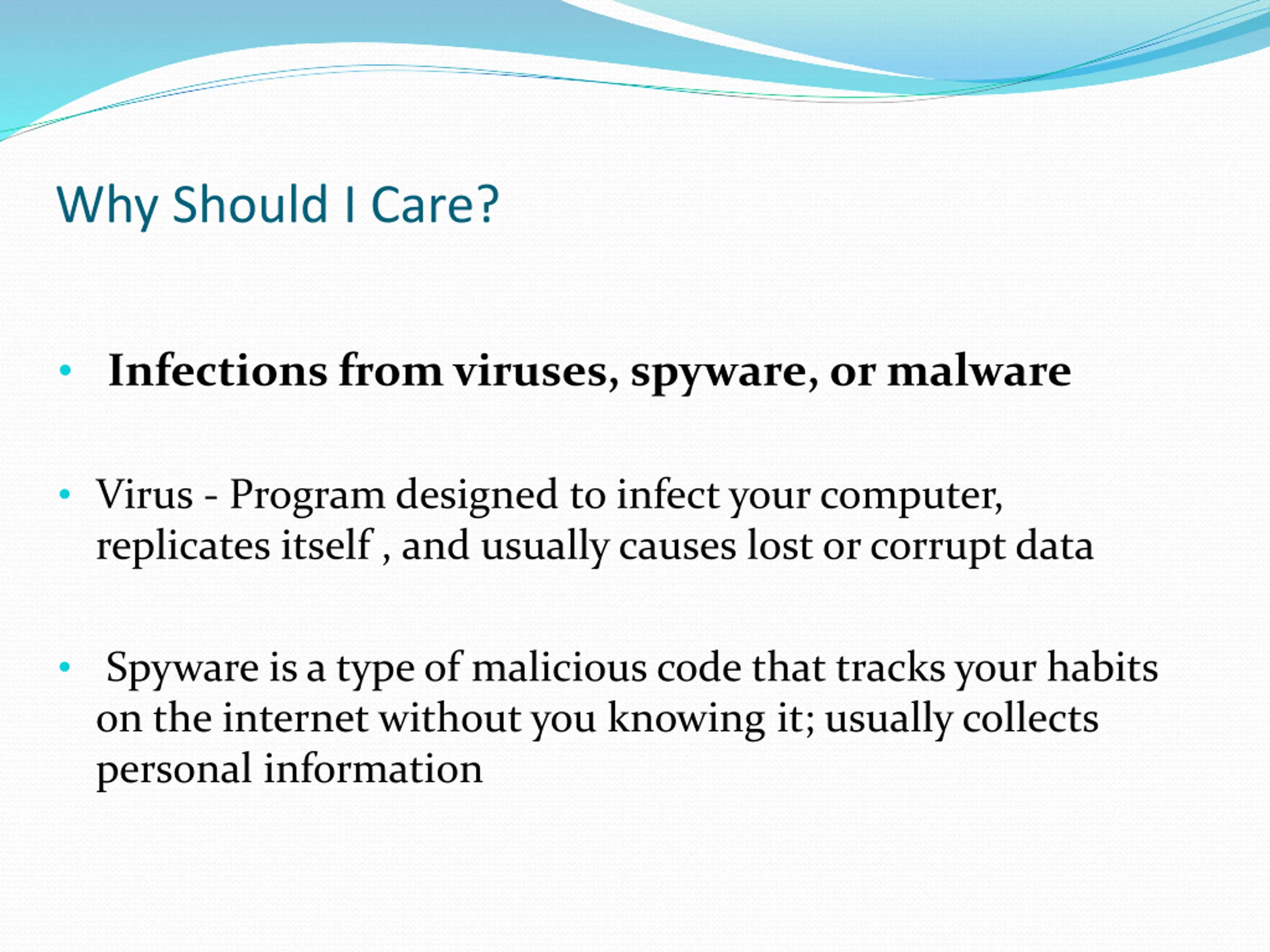Why Should I Care? Infections from viruses, spyware, or malware Virus - Program designed to infect your computer, replicates itself , and usually causes lost or corrupt data Spyware is a type of malicious code that tracks your habits on the internet without you knowing it; usually collects personal information