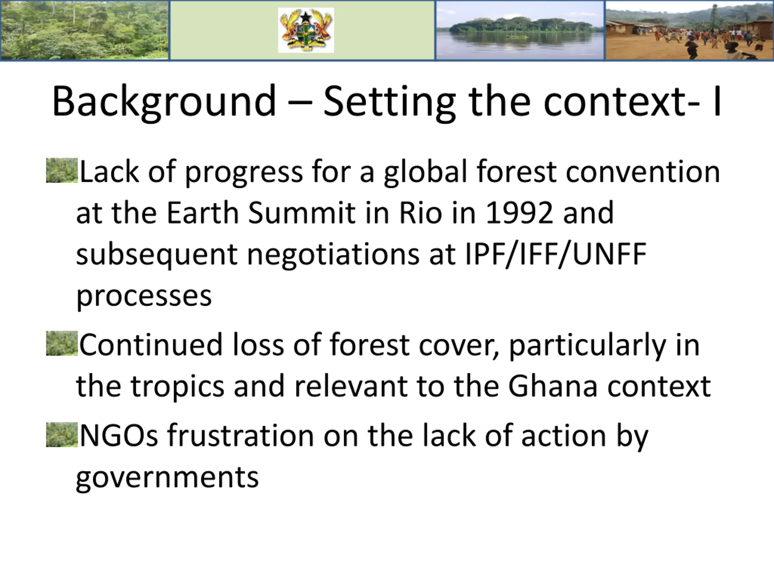 Background Setting the context- I Lack of progress for a global forest convention at the Earth Summit in Rio in 1992 and subsequent negotiations at IPF/IFF/UNFF processes Continued loss of forest cover, particularly in the tropics and relevant to the Ghana context NGOs frustration on the lack of action by governments