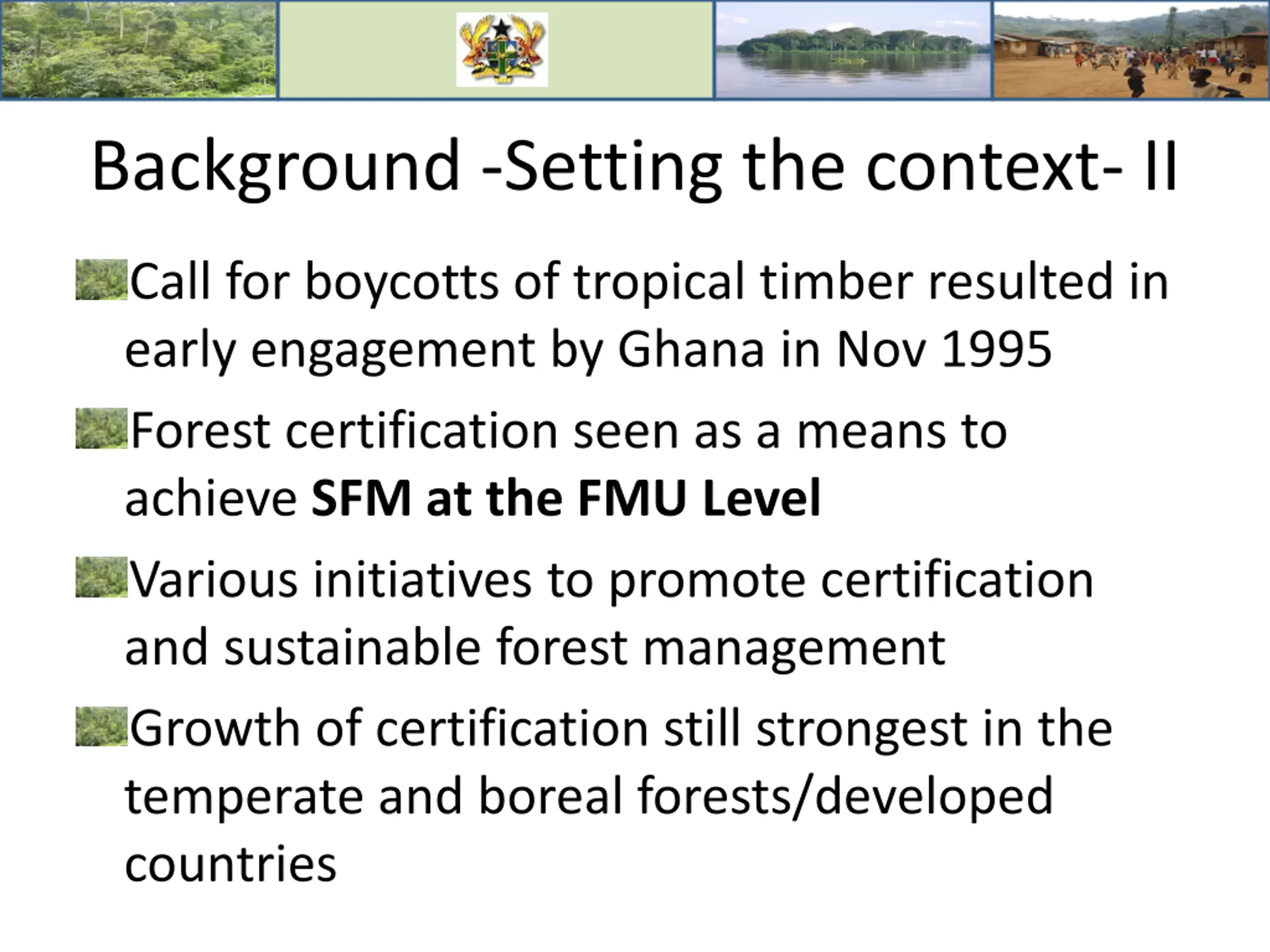 Background -Setting the context- II Call for boycotts of tropical timber resulted in early engagement by Ghana in Nov 1995 Forest certification seen as a means to achieve SFM at the FMU Level Various initiatives to promote certification and sustainable forest management Growth of certification still strongest in the temperate and boreal forests/developed countries