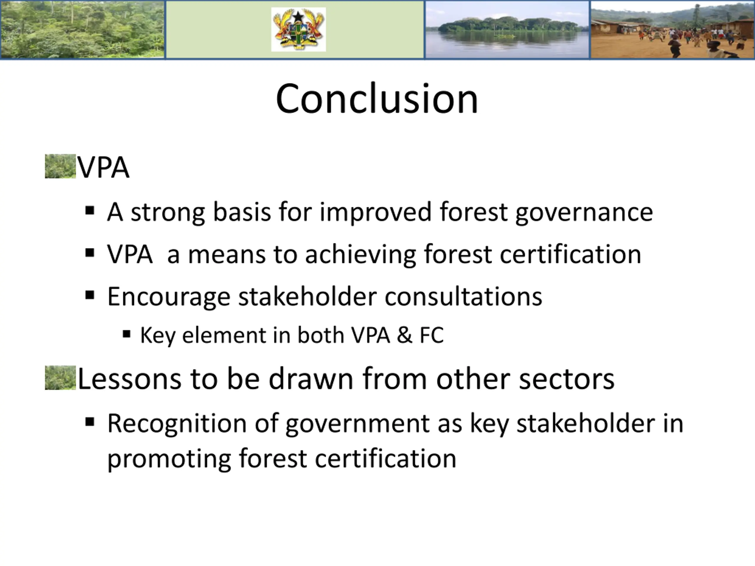 Conclusion VPA A strong basis for improved forest governance VPA a means to achieving forest certification Encourage stakeholder consultations Key element in both VPA & FC Lessons to be drawn from other sectors Recognition of government as key stakeholder in promoting forest certification