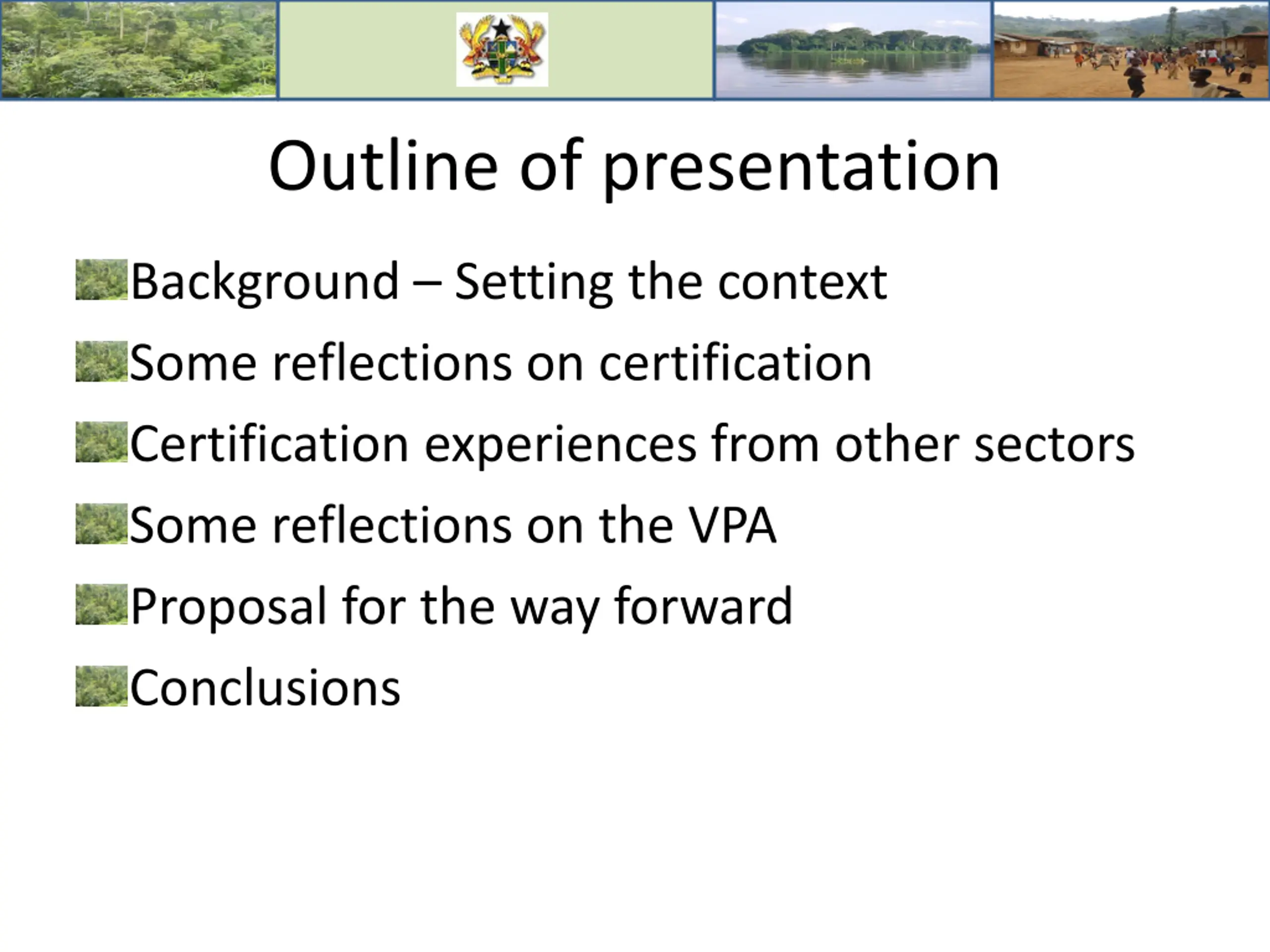 Outline of presentation Background Setting the context Some reflections on certification Certification experiences from other sectors Some reflections on the VPA Proposal for the way forward Conclusions