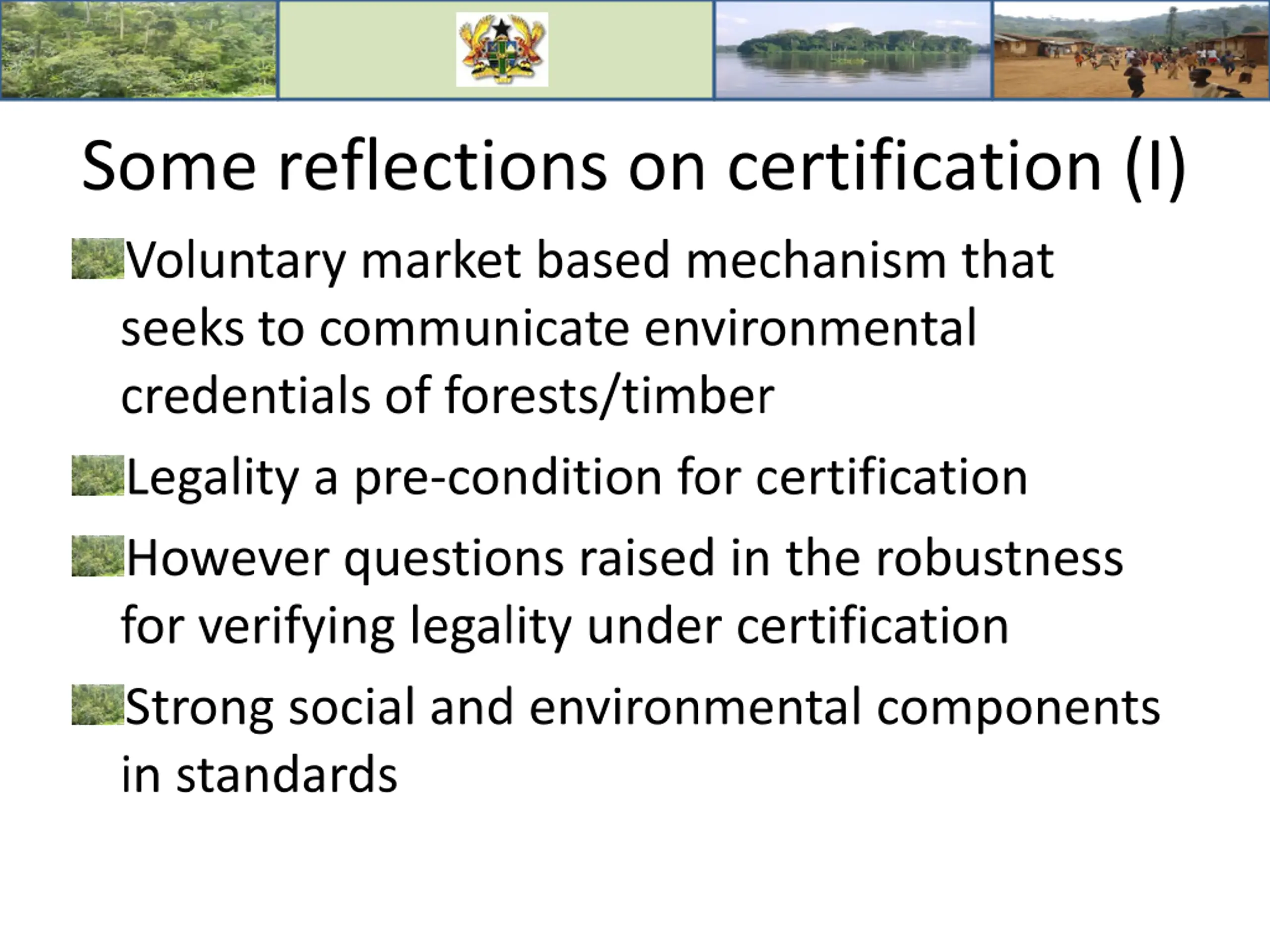 Some reflections on certification (I) Voluntary market based mechanism that seeks to communicate environmental credentials of forests/timber Legality a pre-condition for certification However questions raised in the robustness for verifying legality under certification Strong social and environmental components in standards