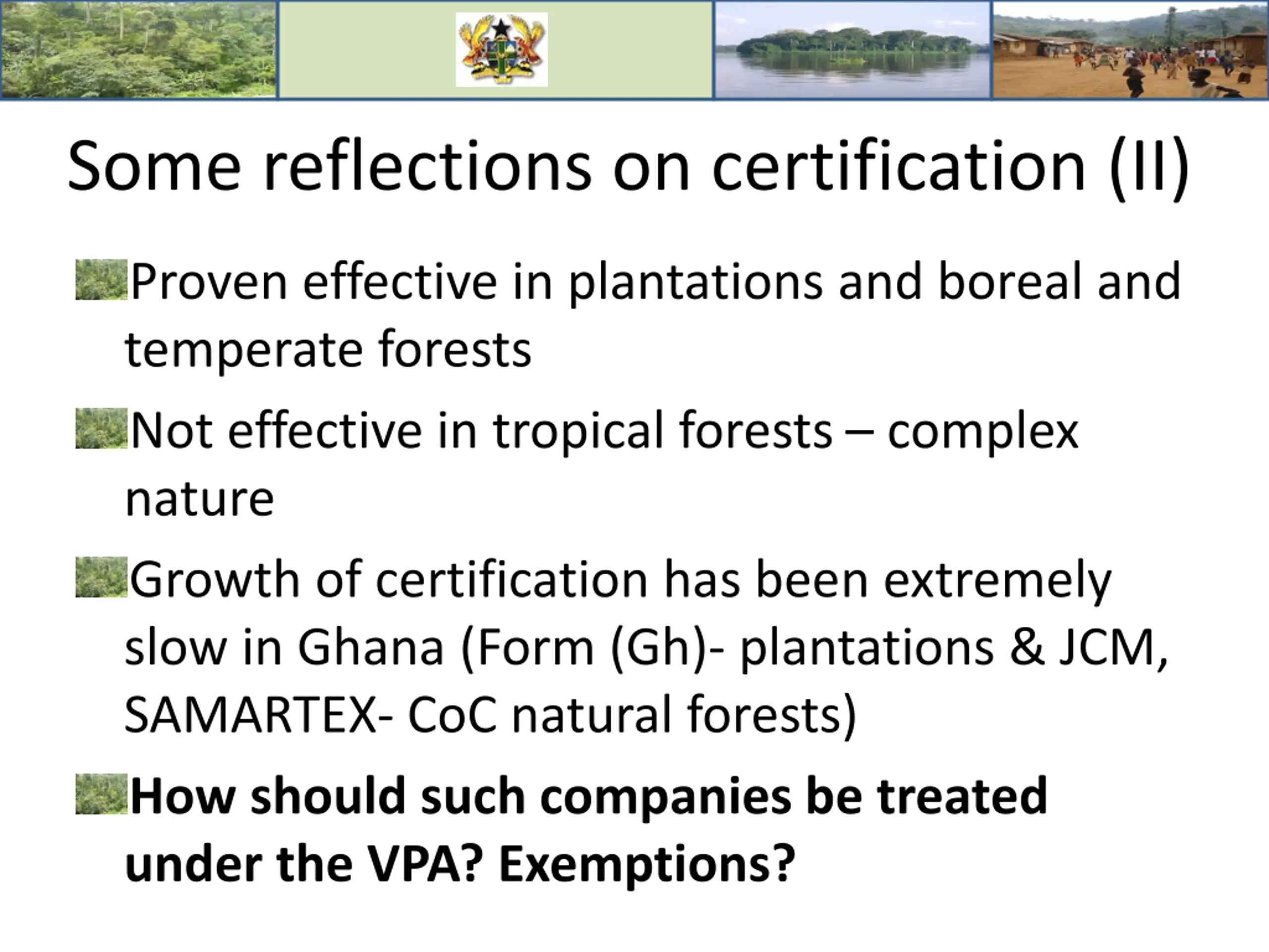 Some reflections on certification (II) Proven effective in plantations and boreal and temperate forests Not effective in tropical forests complex nature Growth of certification has been extremely slow in Ghana (Form (Gh)- plantations & JCM, SAMARTEX- CoC natural forests) How should such companies be treated under the VPA? Exemptions?
