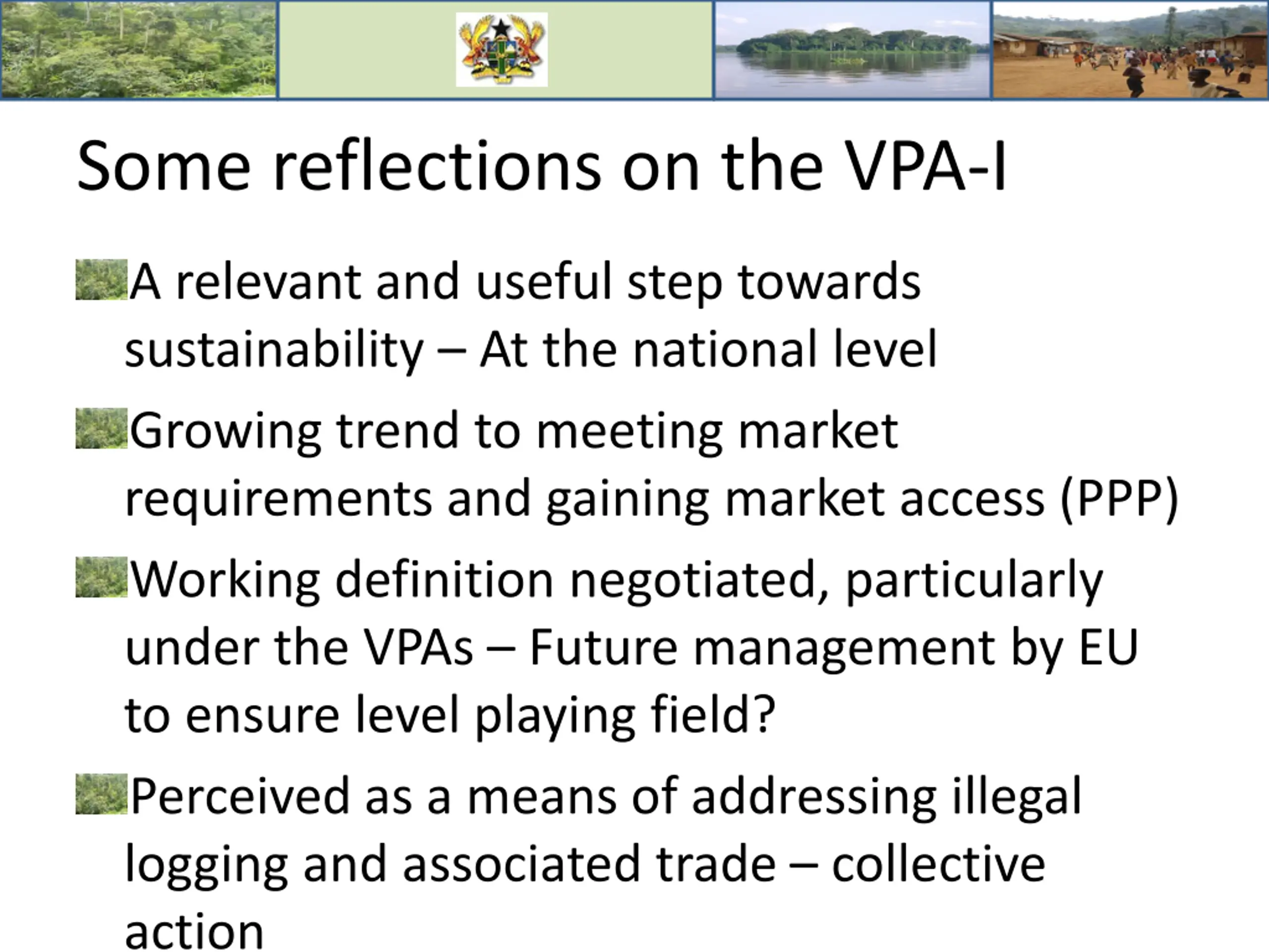 Some reflections on the VPA-I A relevant and useful step towards sustainability At the national level Growing trend to meeting market requirements and gaining market access (PPP) Working definition negotiated, particularly under the VPAs Future management by EU to ensure level playing field? Perceived as a means of addressing illegal logging and associated trade collective action