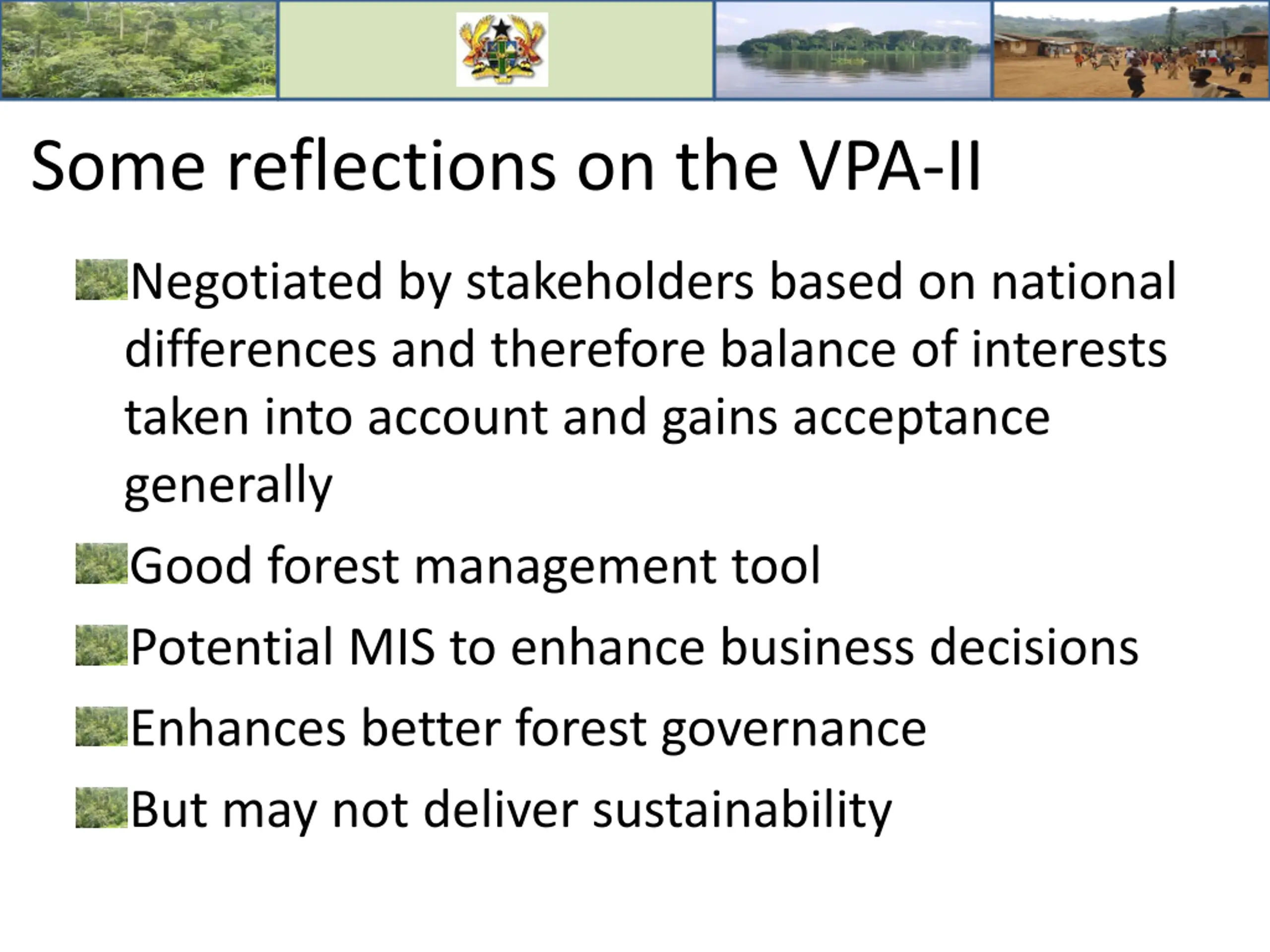 Some reflections on the VPA-II Negotiated by stakeholders based on national differences and therefore balance of interests taken into account and gains acceptance generally Good forest management tool Potential MIS to enhance business decisions Enhances better forest governance But may not deliver sustainability