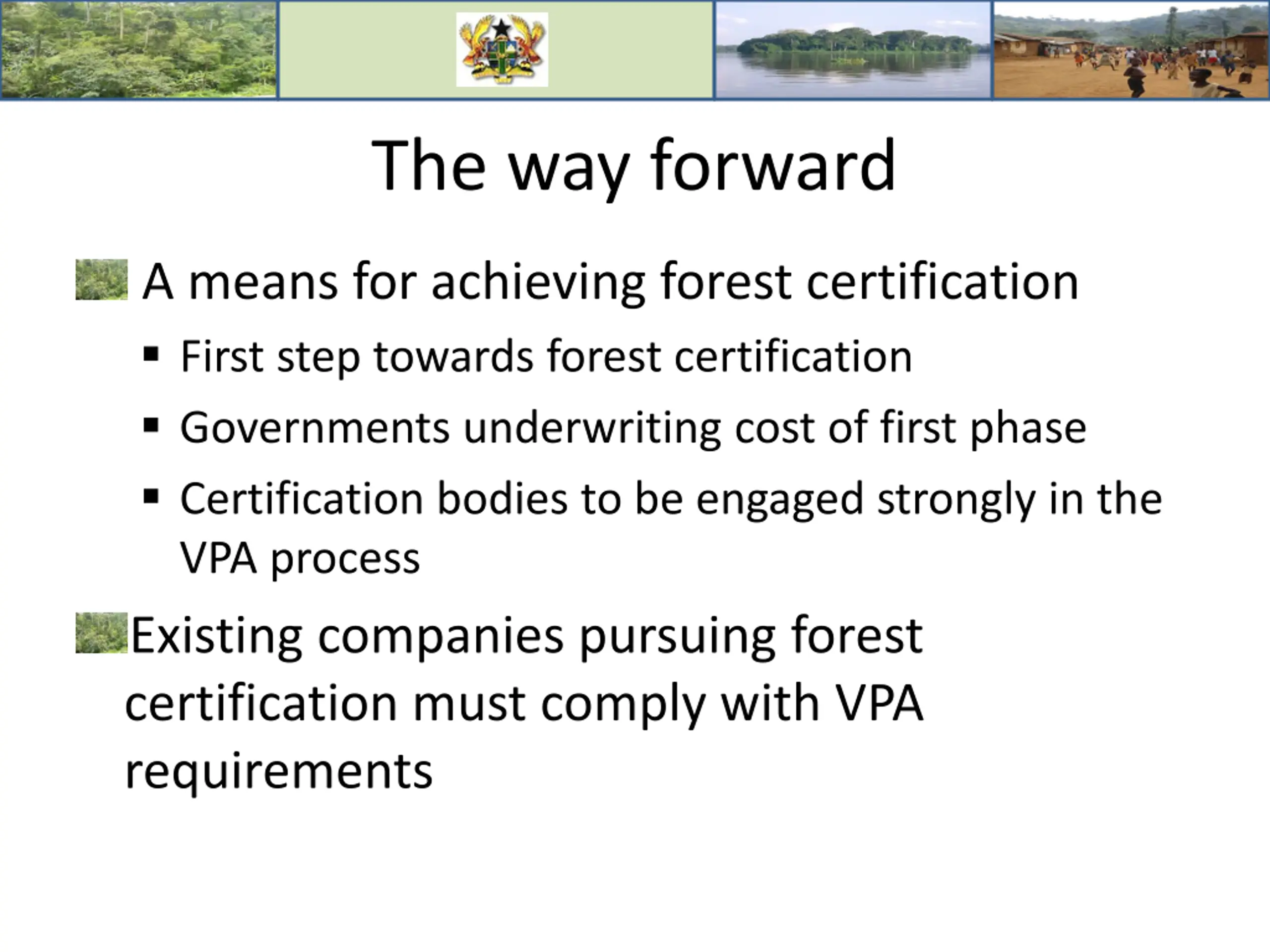 The way forward A means for achieving forest certification First step towards forest certification Governments underwriting cost of first phase Certification bodies to be engaged strongly in the VPA process Existing companies pursuing forest certification must comply with VPA requirements