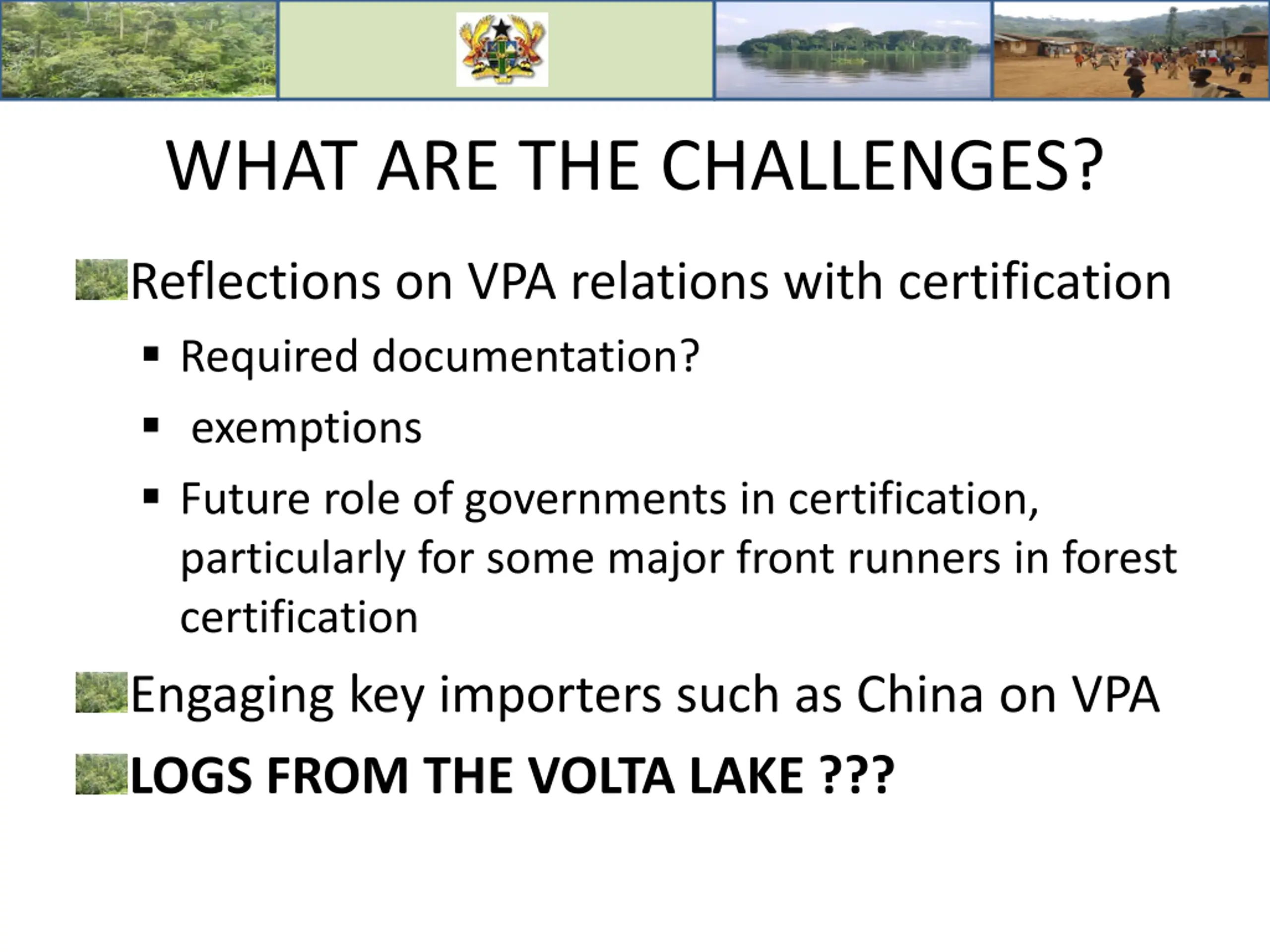 WHAT ARE THE CHALLENGES? Reflections on VPA relations with certification Required documentation? exemptions Future role of governments in certification, particularly for some major front runners in forest certification Engaging key importers such as China on VPA LOGS FROM THE VOLTA LAKE ???