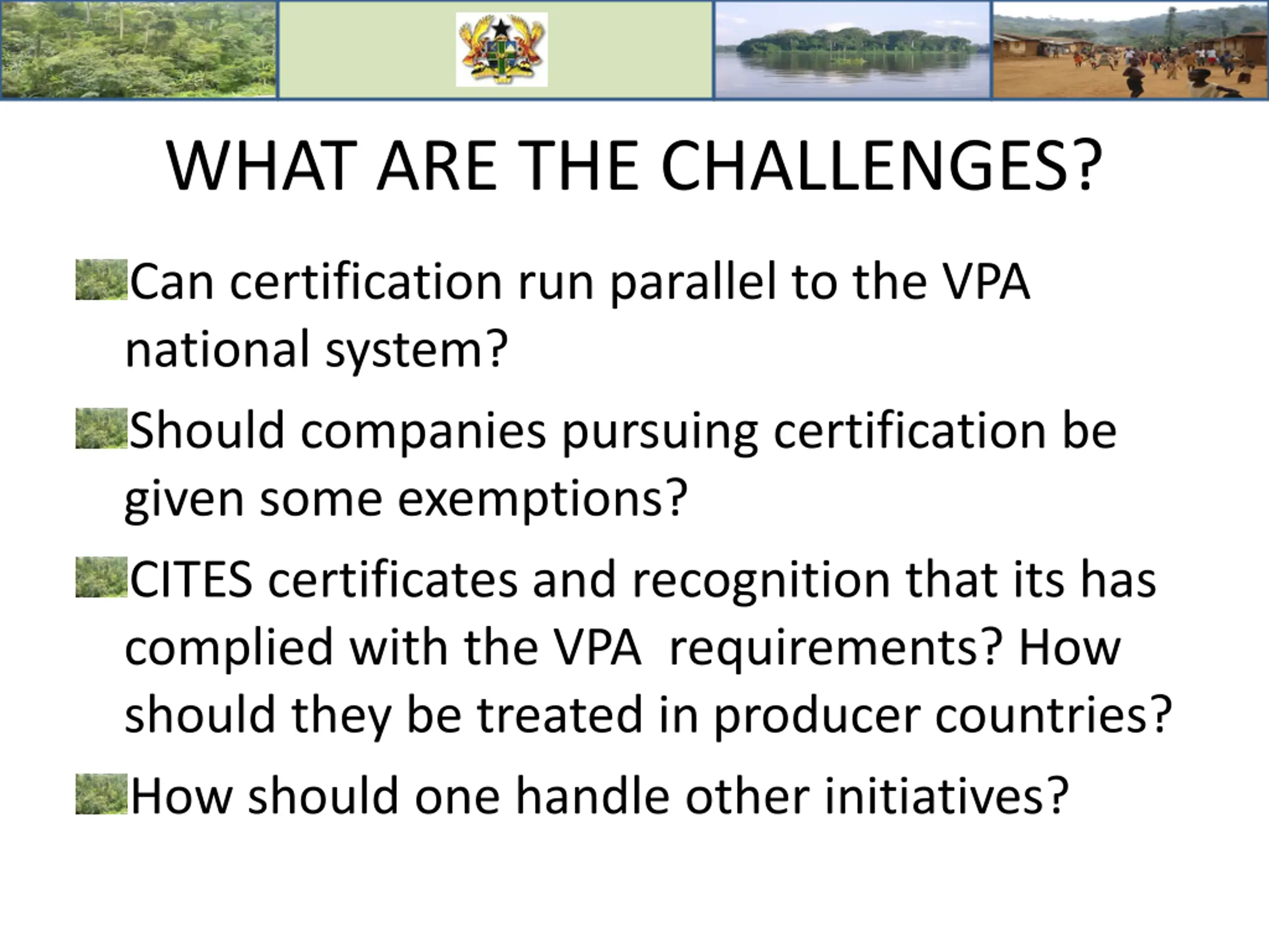 WHAT ARE THE CHALLENGES? Can certification run parallel to the VPA national system? Should companies pursuing certification be given some exemptions? CITES certificates and recognition that its has complied with the VPA requirements? How should they be treated in producer countries? How should one handle other initiatives?