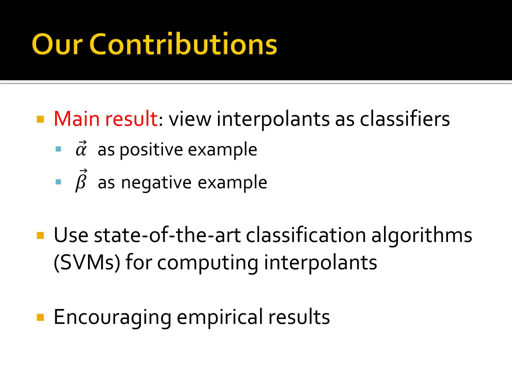 Main result: view interpolants as classifiers ? as positive example ? asnegativeexample Use state-of-the-art classification algorithms (SVMs) for computing interpolants Encouraging empirical results
