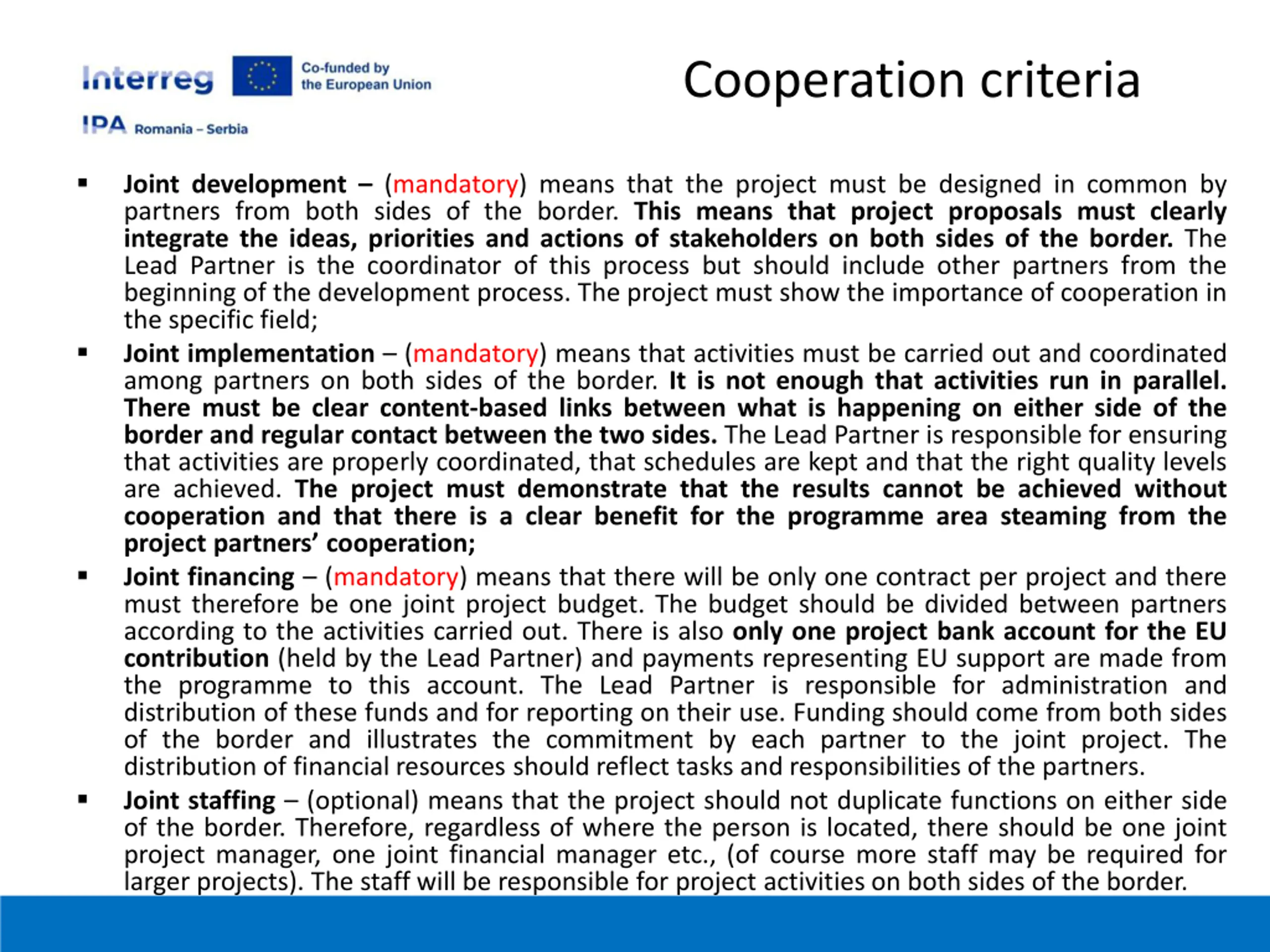 Cooperation criteria Joint development (mandatory) means that the project must be designed in common by partners from both sides of the border. This means that project proposals must clearly integrate the ideas, priorities and actions of stakeholders on both sides of the border. The Lead Partner is the coordinator of this process but should include other partners from the beginning of the development process. The project must show the importance of cooperation in the specific field; Joint implementation (mandatory) means that activities must be carried out and coordinated among partners on both sides of the border. It is not enough that activities run in parallel. There must be clear content-based links between what is happening on either side of the border and regular contact between the two sides. The Lead Partner is responsible for ensuring that activities are properly coordinated, that schedules are kept and that the right quality levels are achieved. The project must demonstrate that the results cannot be achieved without cooperation and that there is a clear benefit for the programme area steaming from the project partners cooperation; Joint financing (mandatory) means that there will be only one contract per project and there must therefore be one joint project budget. The budget should be divided between partners according to the activities carried out. There is also only one project bank account for the EU contribution (held by the Lead Partner) and payments representing EU support are made from the programme to this account. The Lead Partner is responsible for administration and distribution of these funds and for reporting on their use. Funding should come from both sides of the border and illustrates the commitment by each partner to the joint project. The distribution of financial resources should reflect tasks and responsibilities of the partners. Joint staffing (optional) means that the project should not duplicate functions on either side of the border. Therefore, regardless of where the person is located, there should be one joint project manager, one joint financial manager etc., (of course more staff may be required for larger projects). The staff will be responsible for project activities on both sides of the border.