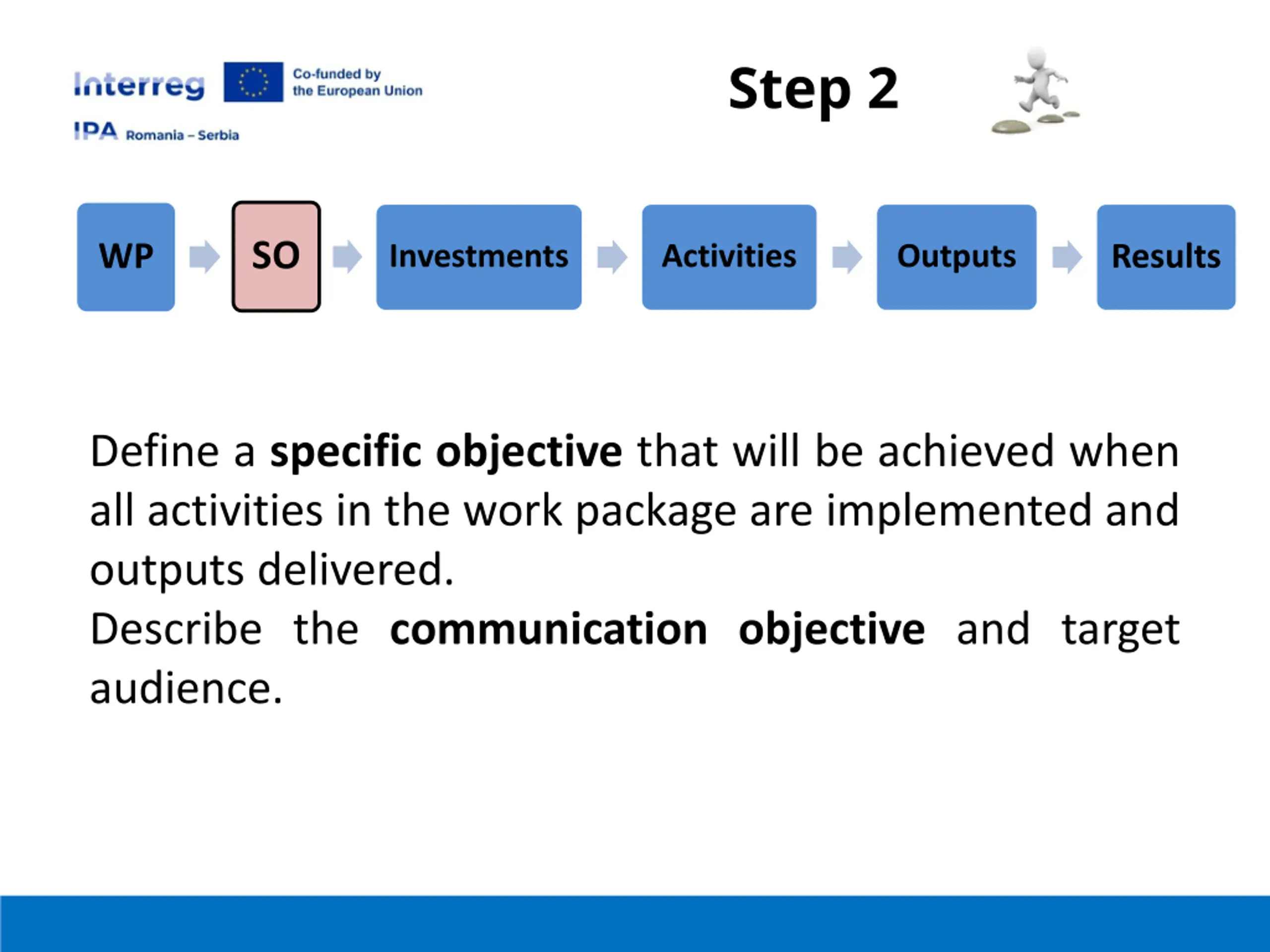 Step 2 SO WP Results Investments Activities Outputs Define a specific objective that will be achieved when all activities in the work package are implemented and outputs delivered. Describe the communication objective and target audience.
