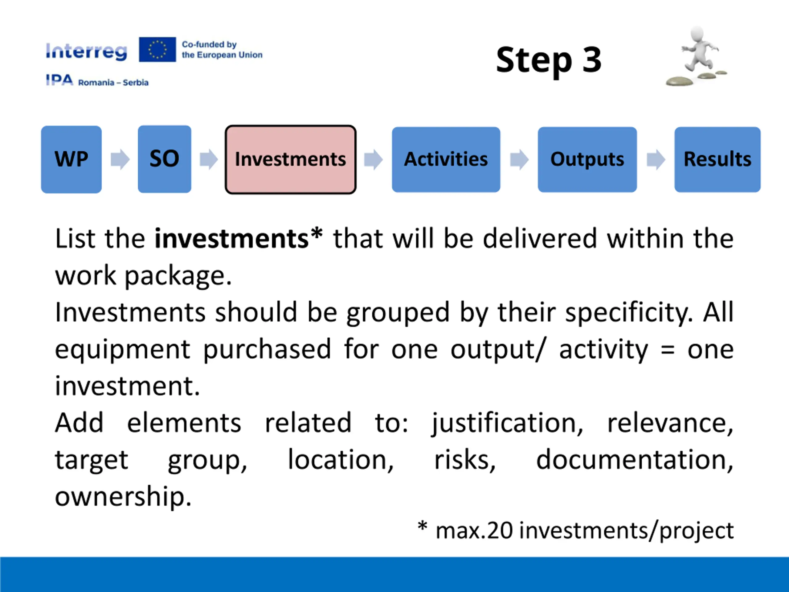 Step 3 SO WP Results Investments Activities Outputs List the investments* that will be delivered within the work package. Investments should be grouped by their specificity. All equipment purchased for one output/ activity = one investment. Add elements related to: justification, relevance, target group, location, ownership. risks, documentation, * max.20 investments/project