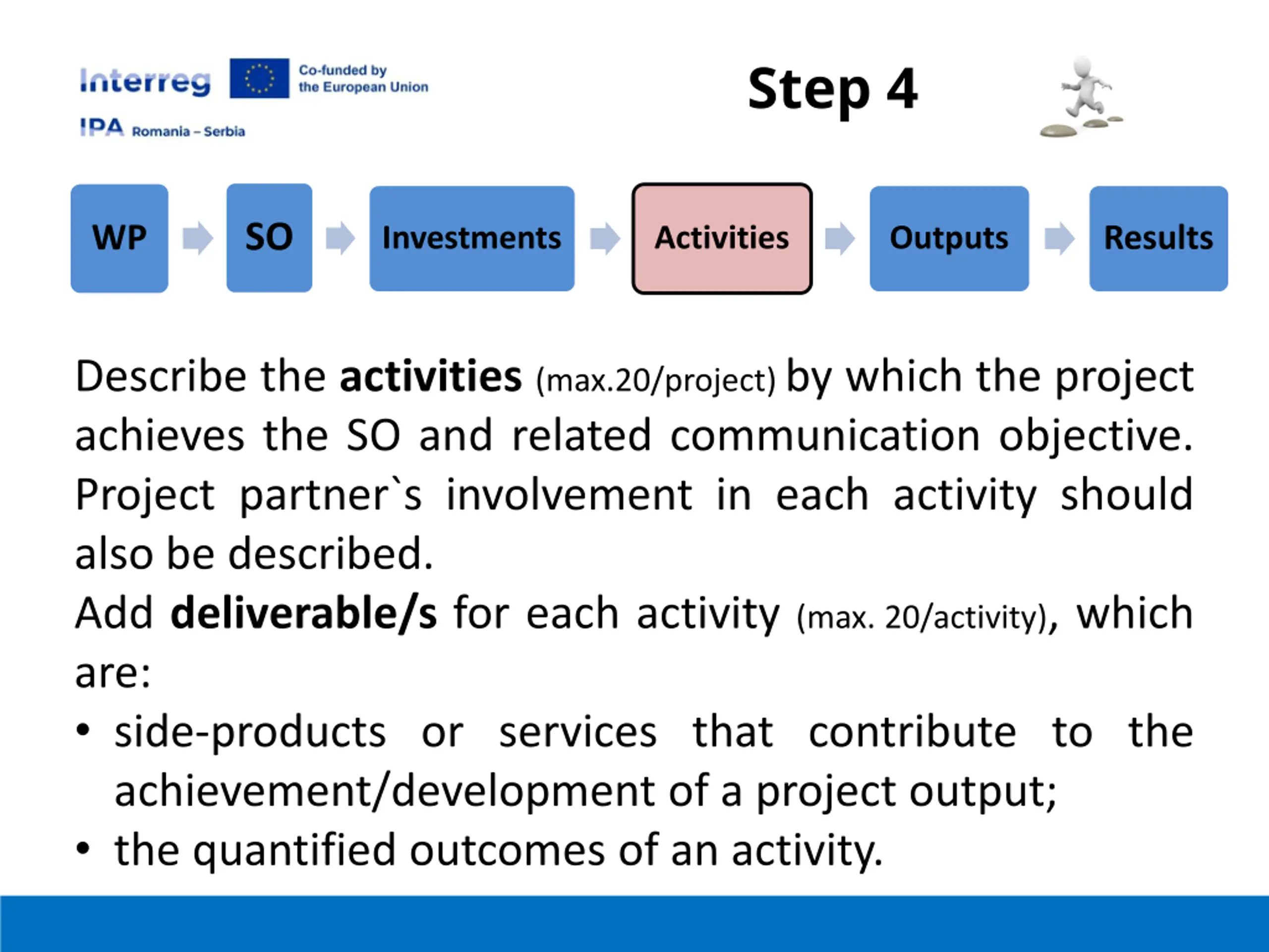 Step 4 SO WP Results Investments Activities Outputs Describe the activities (max.20/project) by which the project achieves the SO and related communication objective. Project partner`s involvement in each activity should also be described. Add deliverable/s for each activity (max. 20/activity), which are: side-products or services that contribute to the achievement/development of a project output; the quantified outcomes of an activity.