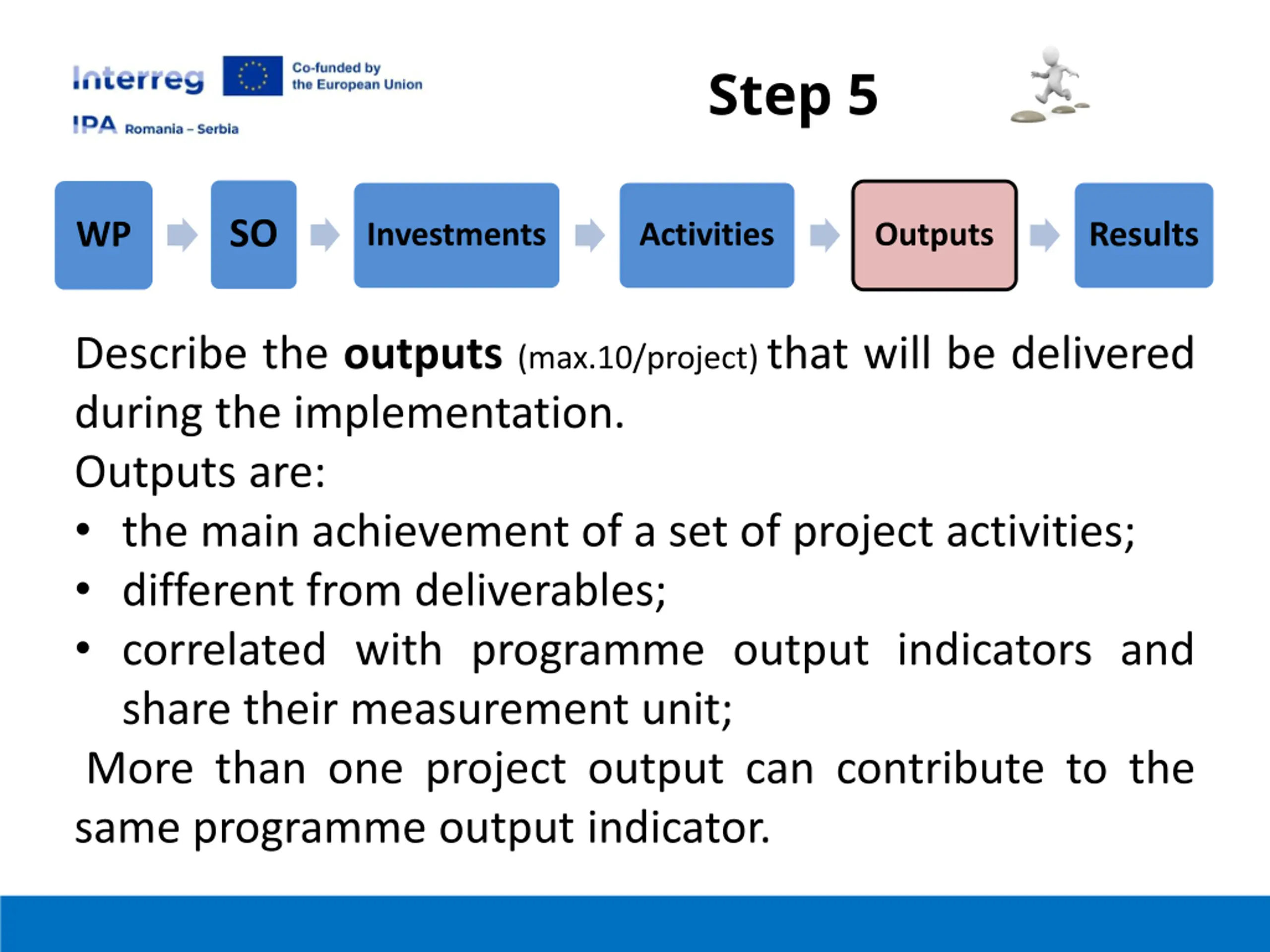 Step 5 SO WP Results Investments Activities Outputs Describe the outputs (max.10/project) that will be delivered during the implementation. Outputs are: the main achievement of a set of project activities; different from deliverables; correlated with programme output indicators and share their measurement unit; More than one project output can contribute to the same programme output indicator.