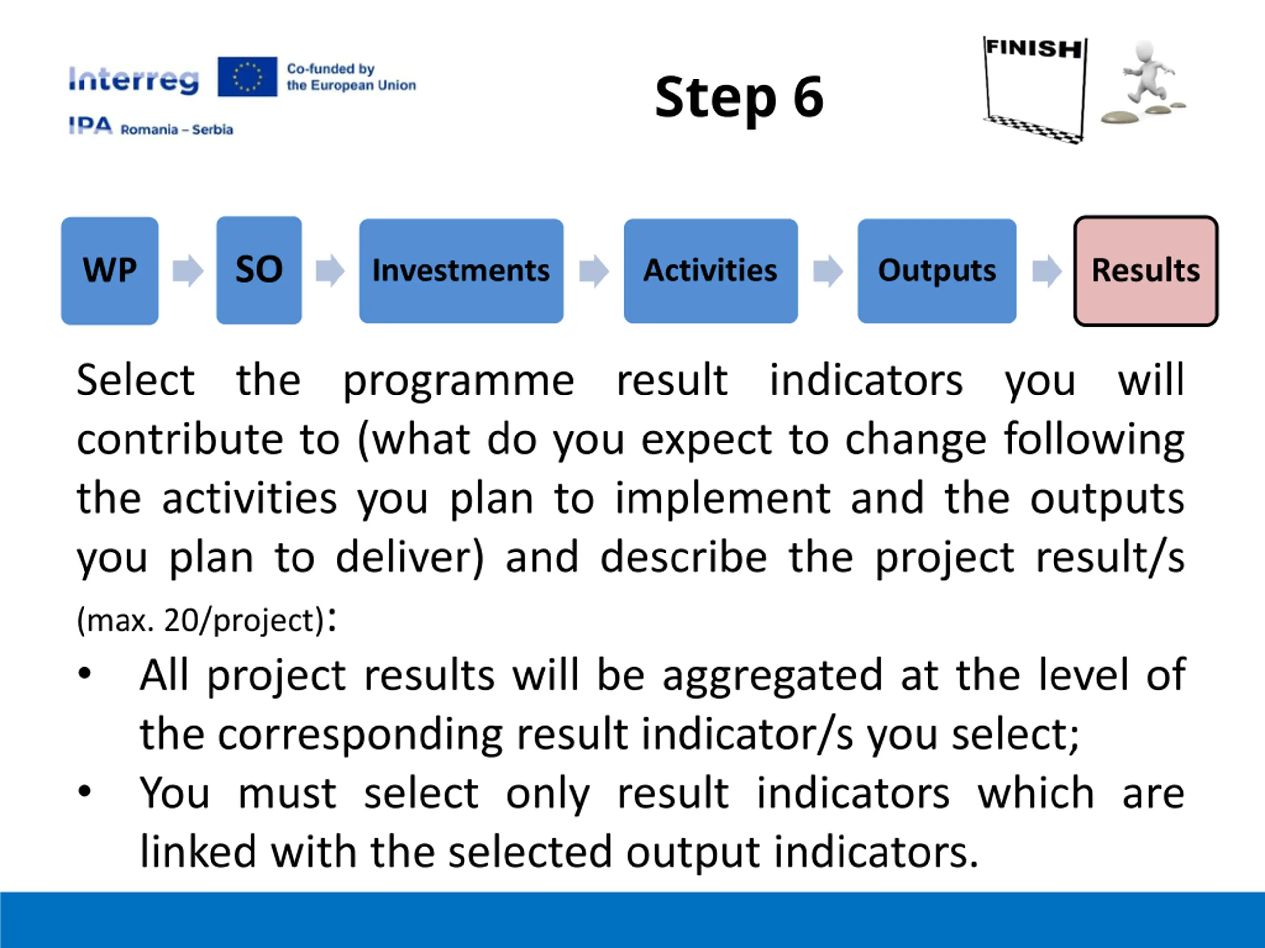 Step 6 SO WP Results Investments Activities Outputs Select the programme result indicators you will contribute to (what do you expect to change following the activities you plan to implement and the outputs you plan to deliver) and describe the project result/s (max. 20/project): All project results will be aggregated at the level of the corresponding result indicator/s you select; You must select only result indicators which are linked with the selected output indicators.