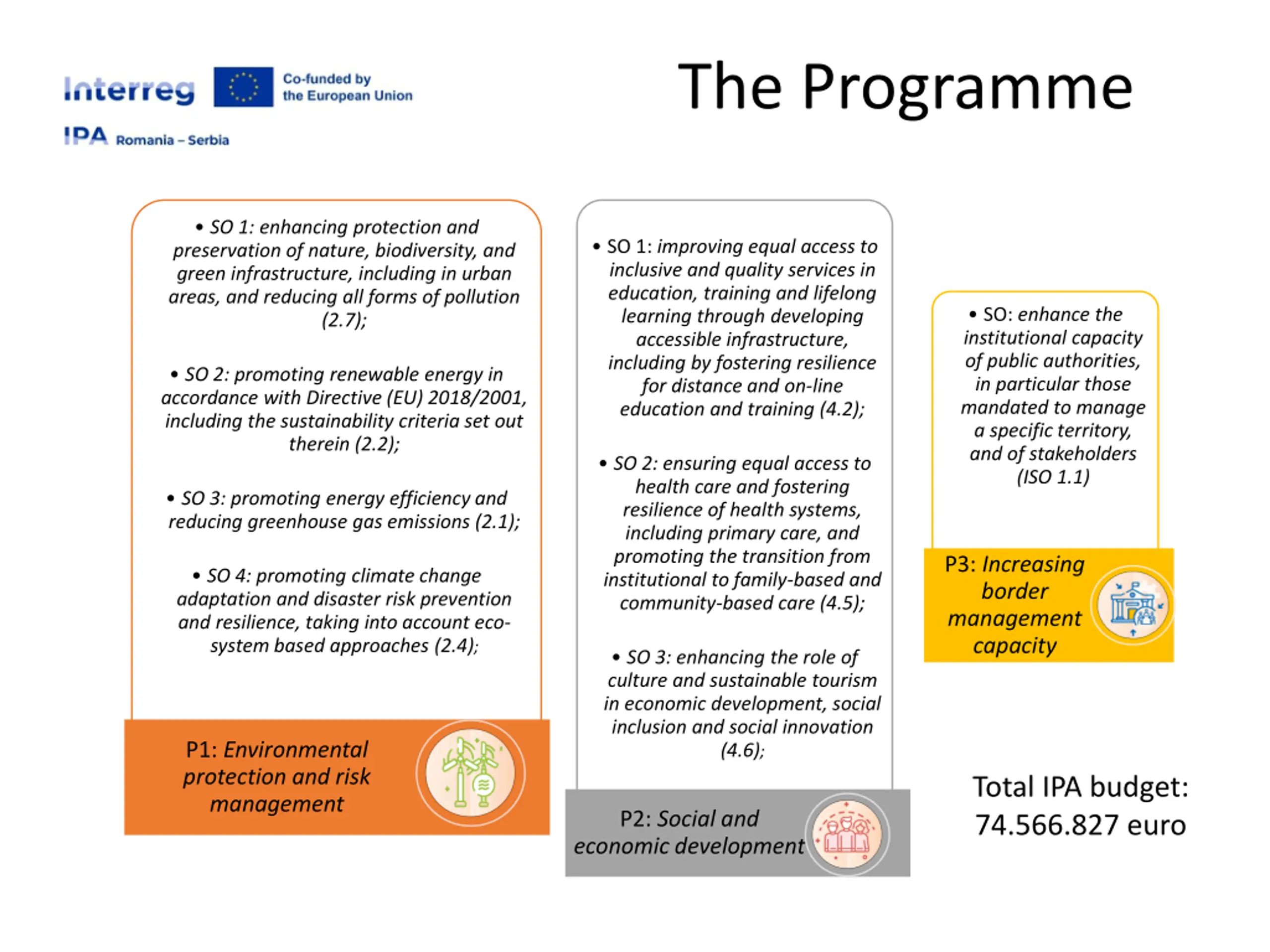 The Programme SO 1: enhancing protection and preservation of nature, biodiversity, and green infrastructure, including in urban areas, and reducing all forms of pollution (2.7); SO 1: improving equal access to inclusive and quality services in education, training and lifelong learning through developing accessible infrastructure, including by fostering resilience for distance and on-line education and training (4.2); SO: enhance the institutional capacity of public authorities, in particular those mandated to manage a specific territory, and of stakeholders (ISO 1.1) SO 2: promoting renewable energy in accordance with Directive (EU) 2018/2001, including the sustainability criteria set out therein (2.2); SO 2: ensuring equal access to health care and fostering resilience of health systems, including primary care, and promoting the transition from institutional to family-based and community-based care (4.5); SO 3: promoting energy efficiency and reducing greenhouse gas emissions (2.1); P3: Increasing border management capacity SO 4: promoting climate change adaptation and disaster risk prevention and resilience, taking into account eco- system based approaches (2.4); SO 3: enhancing the role of culture and sustainable tourism in economic development, social inclusion and social innovation (4.6); P1: Environmental protection and risk management Total IPA budget: 74.566.827 euro P2: Social and economic development